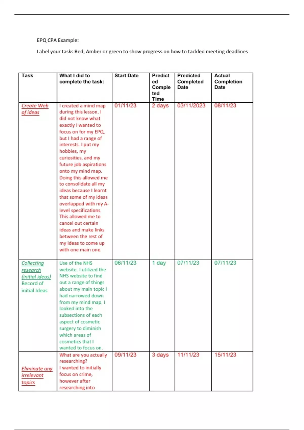 Label your tasks Red, Amber or green to show progress on how to tackled meeting deadlines