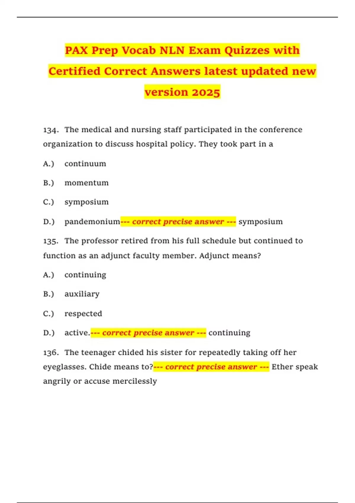 PAX Prep Vocab NLN Exam Quizzes with Certified Correct Answers latest updated new version 2025 134. The medical and nursing staff participated in the conference organization to discuss hospital policy. They took part in a A.) continuum B.) momentum C.) symposium D.) pandemonium--- correct precise answer --- symposium 135. The professor retired from his full schedule but continued to function as an adjunct faculty member. Adjunct means? A.) continuing B.) auxiliary C.) respected D.) active.--- correct precise answer --- continuing 136. The teenager chided his sister for repeatedly taking off her eyeglasses. Chide means to?--- correct precise answer --- Ether speak angrily or accuse mercilessly