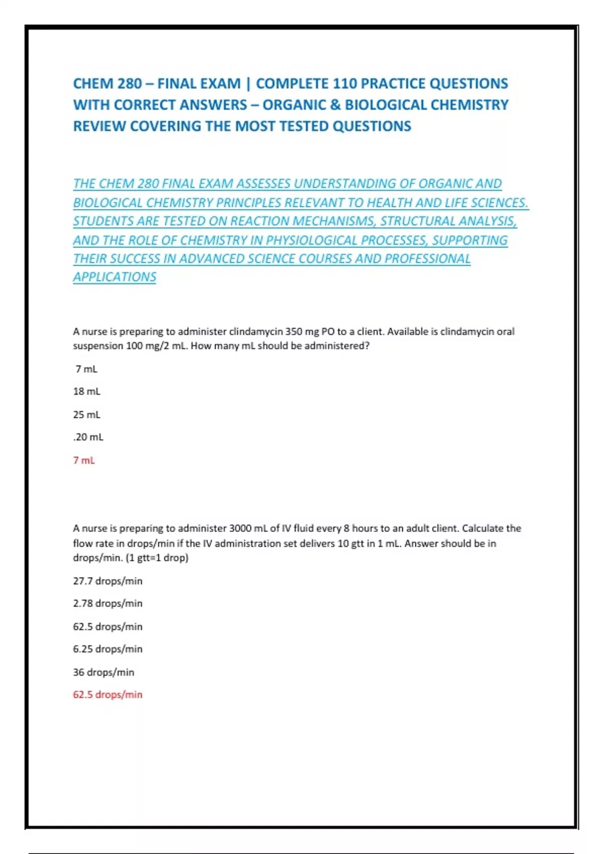 THIS DOCUMENT CONTAINS PRACTICE QUESTIONS AND ANSWERS FOR THE CHEM 280 FINAL EXAM, COVERING TOPICS IN ORGANIC AND BIOLOGICAL CHEMISTRY. INCLUDED ARE QUESTIONS ON FUNCTIONAL GROUPS, CHEMICAL REACTIONS, STRUCTURE AND PROPERTIES OF MOLECULES, BIOCHEMICAL PATHWAYS, AND APPLIED HEALTH SCIENCES CONCEPTS. IDEAL FOR STUDENTS IN NURSING, HEALTH SCIENCES, OR PRE-MED PROGRAMS.