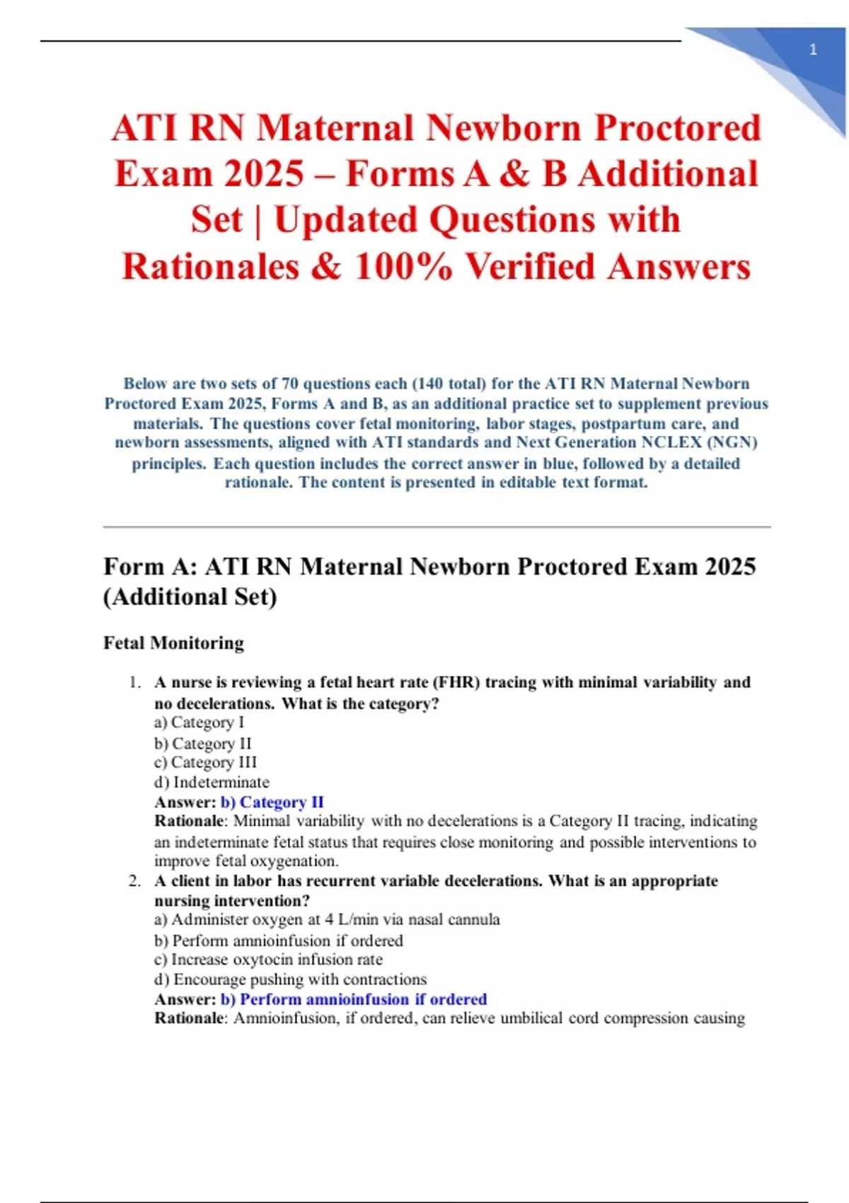 Below are two sets of 70 questions each (140 total) for the ATI RN Maternal Newborn