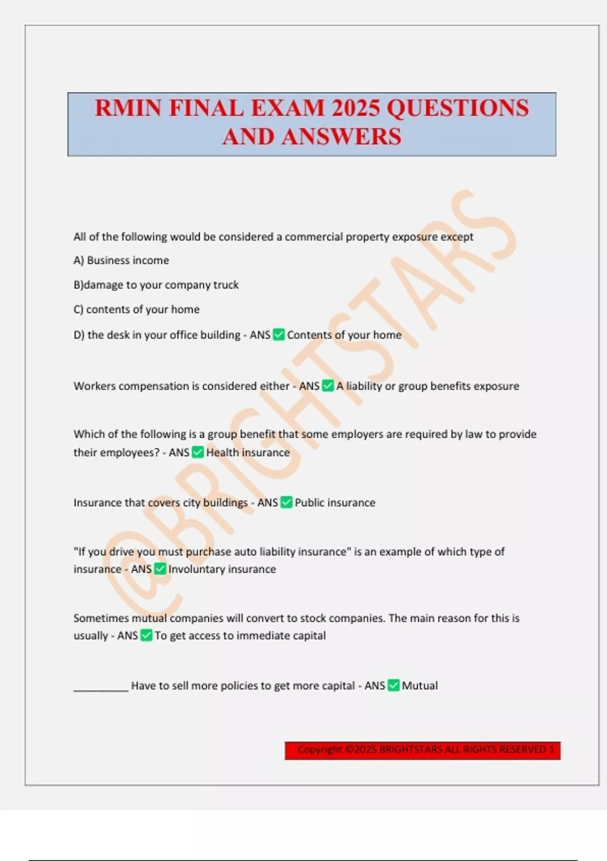 All of the following would be considered a commercial property exposure except A) Business income B)damage to your company truck C) contents of your home D) the desk in your office building - ANS Contents of your home Workers compensation is considered either - ANS A liability or group benefits exposure Which of the following is a group benefit that some employers are required by law to provide their employees? - ANS Health insurance Insurance that covers city buildings - ANS Public insurance "If you drive you must purchase auto liability insurance" is an example of which type of insurance - ANS Involuntary insurance Sometimes mutual companies will convert to stock companies. The main reason for this is usually - ANS To get access to immediate capital _________ Have to sell more policies to get more capital - ANS Mutual RMIN FINAL EXAM 2025 QUESTIONS AND ANSWERS Copyright ©2025 BRIGHTSTARS ALL RIGHTS RESERVED 2 Type of insurer that involves members pulling their premiums together and hiring an attorney in fact to manage their risks - ANS Reciprocals Where are the shares of stock insurers in the top 10 of property and casualty insurance riders in 2019 traded? - ANS On the NYSE Lloyds of London is an insurance company - ANS False All of the following are true about Lloyds managing agent except A) there are fewer managing agents than there are syndicates B) the managing agents are like the employees of the Lloyds syndicates C) Lloyds has around 50 managing agents D) they are the Lloyd's investors - ANS They are the Lloyd's investors What is the closest to the equivalent of "the insurance company" at Lloyd's - ANS A syndicate Life insurers like to market directly for which one of the following reasons - ANS They want to maintain control over Sailes Direct writer is also known as a "captive agent" - ANS True Which of the following companies used direct writers to market their policies - ANS State farm An agent that is authorized to represent several different insurance companies and has limited binding authority - AN