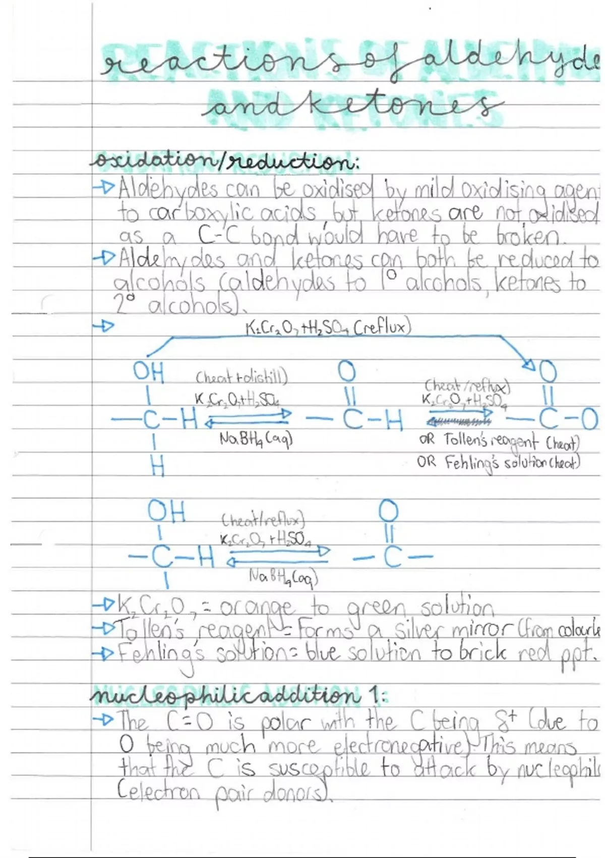 AQA A-Level chemistry notes covering all areas of aldehydes and ketones, such as oxidation, reduction, nucleophilic addition, optical isomerism, distinction between carbonyl groups, etc. Predicted A* quality.
