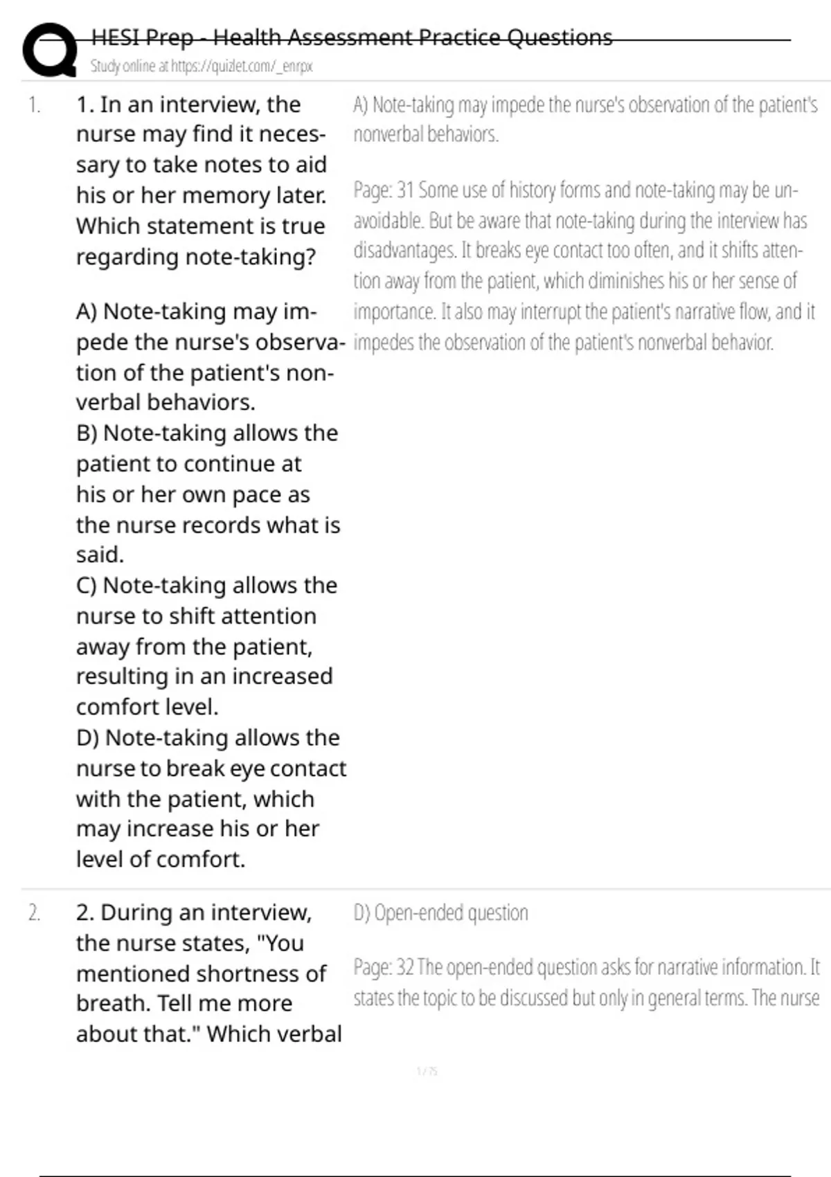 1. 1. In an interview, the A) Note-taking may impede the nurse's observation of the patient's