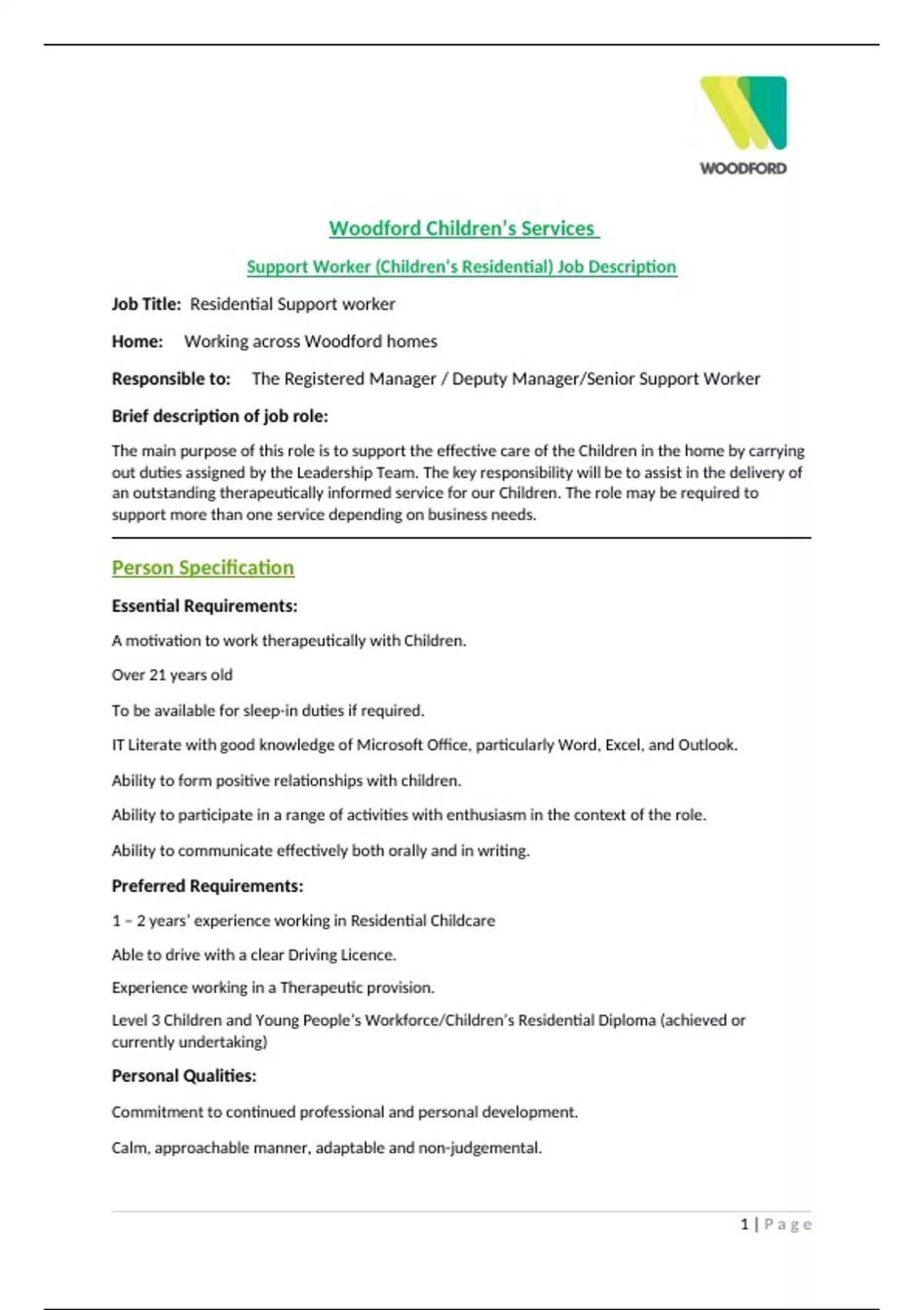  To work in accordance with Woodford Children’s Service & Therapeutic Community Values.