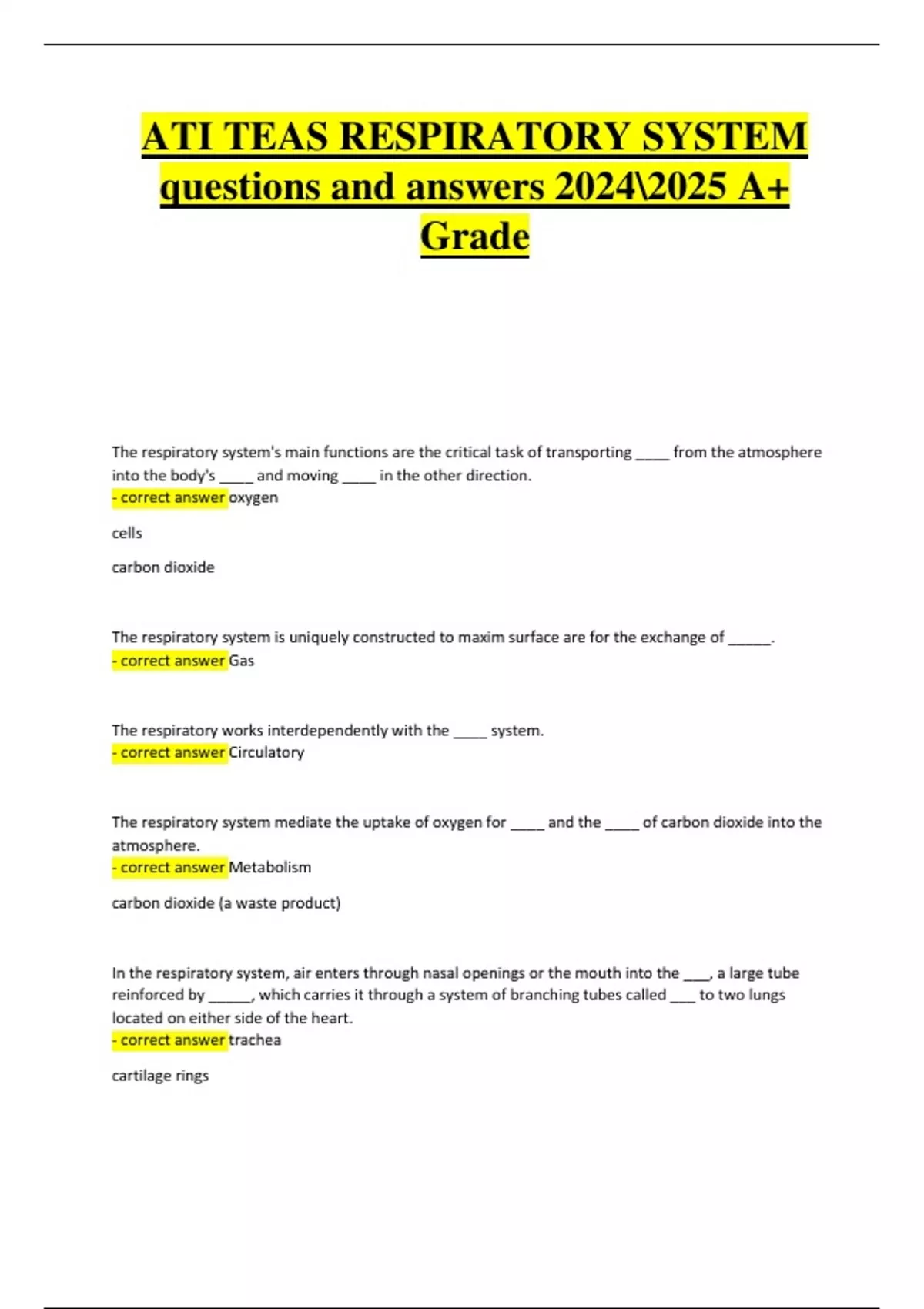ATI TEAS Respiratory System – Questions and Answers 2024/2025 (A+ Grade Review Material)
