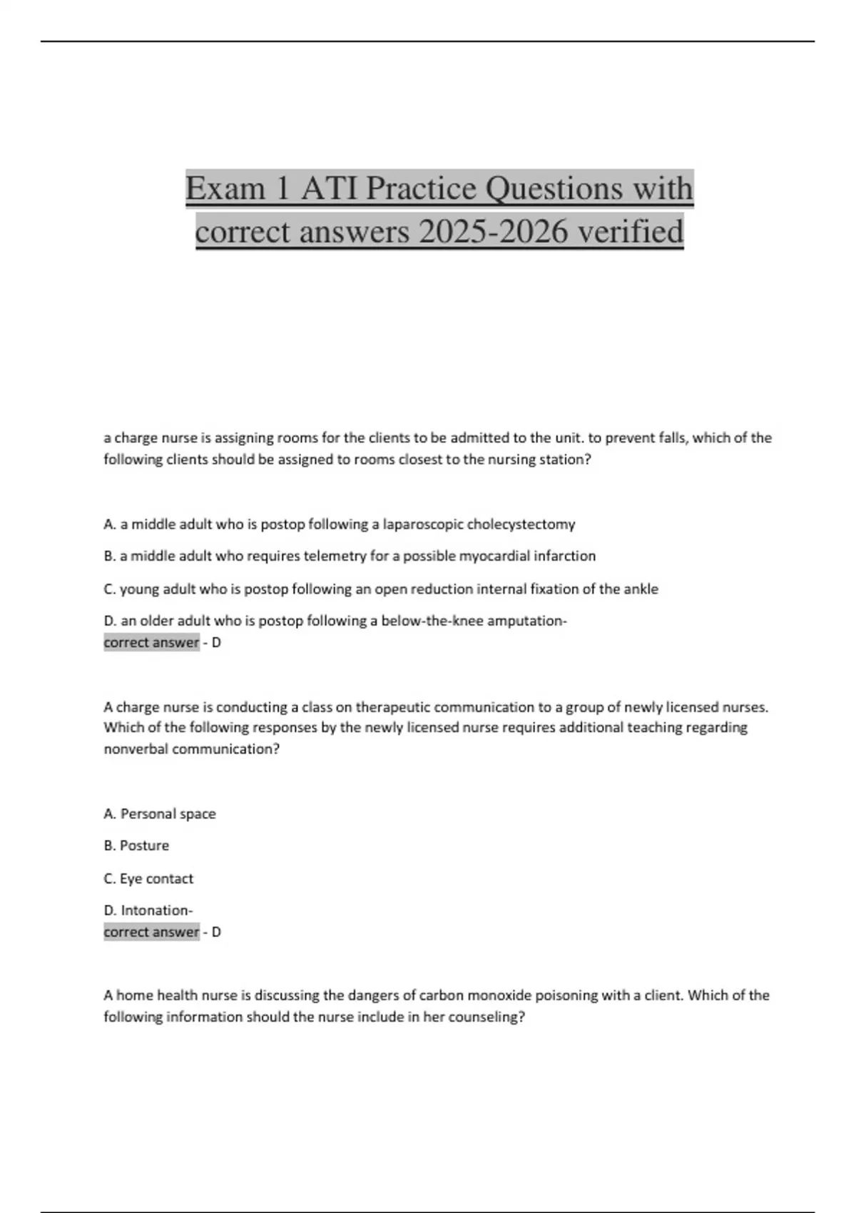 This document provides a complete set of ATI Exam 1 practice questions with verified correct answers, updated for the 2025–2026 academic cycle. It covers foundational nursing topics such as safety, infection control, communication, vital signs, documentation, and the nursing process. Designed to align with ATI’s standards for Practice Exam 1, this resource is ideal for early-stage nursing students preparing for their first major assessment.