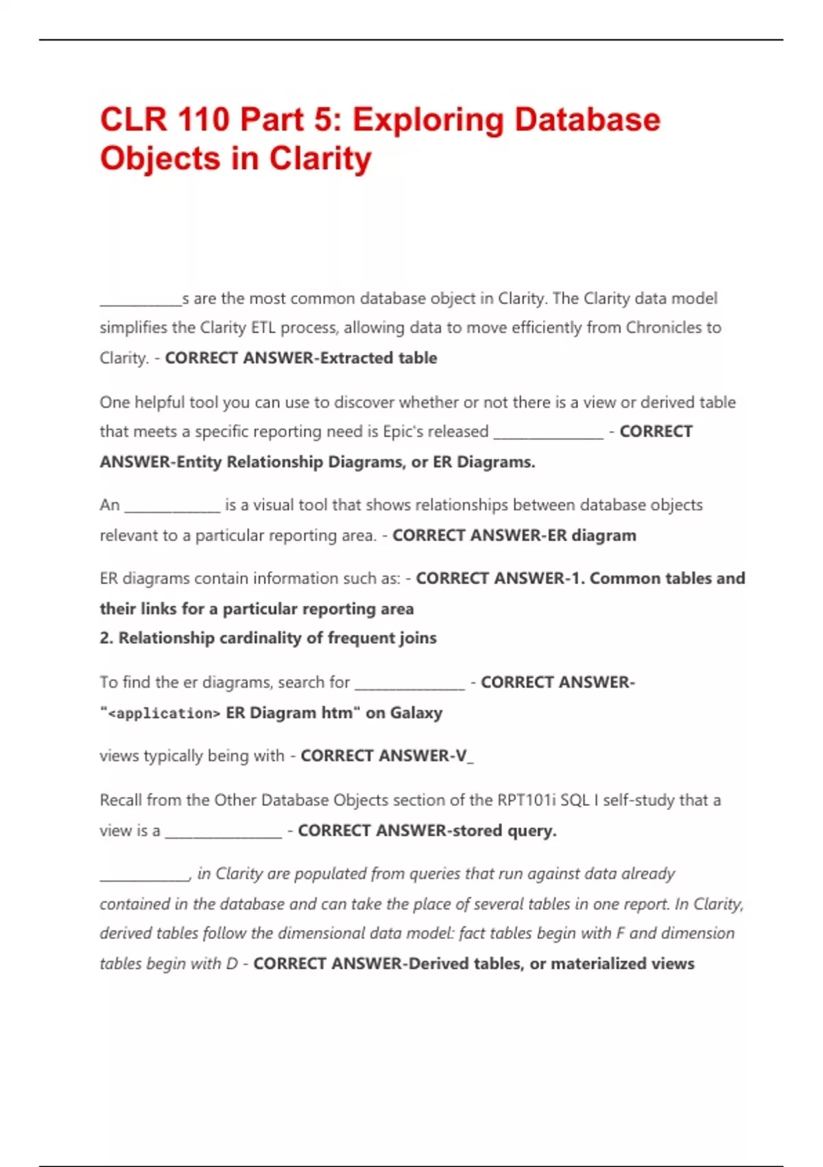 ____________s are the most common database object in Clarity. The Clarity data model simplifies the Clarity ETL process, allowing data to move efficiently from Chronicles to Clarity. - CORRECT ANSWER-Extracted table One helpful tool you can use to discover whether or not there is a view or derived table that meets a specific reporting need is Epic's released ________________ - CORRECT ANSWER-Entity Relationship Diagrams, or ER Diagrams. An ______________ is a visual tool that shows relationships between database objects relevant to a particular reporting area. - CORRECT ANSWER-ER diagram ER diagrams contain information such as: - CORRECT ANSWER-1. Common tables and their links for a particular reporting area 2. Relationship cardinality of frequent joins To find the er diagrams, search for ________________ - CORRECT ANSWER- "<application> ER Diagram htm" on Galaxy views typically being with - CORRECT ANSWER-V_ Recall from the Other Database Objects section of the RPT101i SQL I self-study that a view is a _________________ - CORRECT ANSWER-stored query. _____________, in Clarity are populated from queries that run against data already contained in the database and can take the place of several tables in one report. In Clarity, derived tables follow the dimensional data model: fact tables begin with F and dimension tables begin with D - CORRECT ANSWER-Derived tables, or materialized viewsThe _________________ are a library of User Defined Functions (UDFs) developed and released by Epic to accommodate both Microsoft SQL Server and Oracle syntax - CORRECT ANSWER-Epic Standard SQL Functions If you have reports that are taking a particularly long time to run, one recommended practice is replacing any Epic Standard SQL Functions used in the report with ________________ - CORRECT ANSWER-vendor-specific functions.