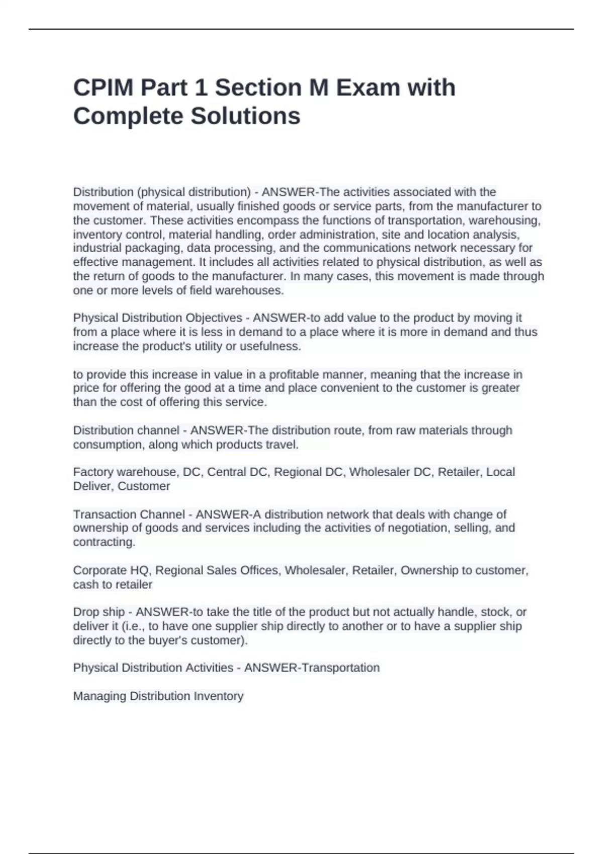 CPIM Part 1 Section M Exam with Complete Solutions