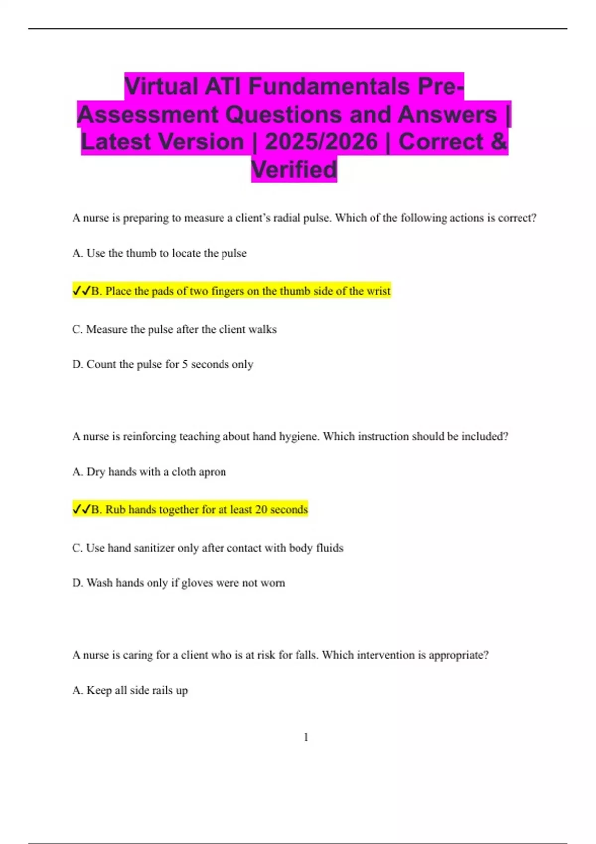 Virtual ATI Fundamentals Pre- Assessment Questions and Answers | Latest Version | 2025/2026 | Correct & Verified A nurse is preparing to measure a client’s radial pulse. Which of the following actions is correct? A. Use the thumb to locate the pulse B. Place the pads of two fingers on the thumb side of the wrist C. Measure the pulse after the client walks D. Count the pulse for 5 seconds only A nurse is reinforcing teaching about hand hygiene. Which instruction should be included? A. Dry hands with a cloth apron B. Rub hands together for at least 20 seconds C. Use hand sanitizer only after contact with body fluids D. Wash hands only if gloves were not worn A nurse is caring for a client who is at risk for falls. Which intervention is appropriate? A. Keep all side rails up 2 B. Place the client in a wheelchair without brakes C. Ensure the call light is within reach D. Leave the bed in high position to prevent straining A nurse is documenting care in a client’s chart. Which of the following is correctly written? A. "Client probably drank 200 mL." B. "Client ambulated 25 feet with walker at 0900." C. "Looks better today. Seems fine." D. "Dressing changed. Looks OK." A nurse is applying anti-embolism stockings. What action is correct? A. Roll the stockings down if too tight B. Smooth wrinkles after application C. Apply only at bedtime D. Pull tightly to compress the leg A nurse is preparing to transfer a client from the bed to a chair. What should the nurse do first? A. Assess the client’s strength and balance 3 B. Lock the bed wheels after transfer C. Apply a gait belt after standing D. Place the chair on the weak side A nurse is reinforcing teaching about pain management. Which statement indicates understanding? A. “I’ll ask for pain medicine before the pain gets severe.” B. “I’ll wait until the pain is unbearable.” C. “I’ll avoid pain meds so I don’t get addicted.” D. “I’ll only take meds at bedtime.” A nurse is caring for a client in contact precautions for C. difficile. What PPE is required? A. Mask and gloves B. Gown and gloves C. N95 respirator and gown