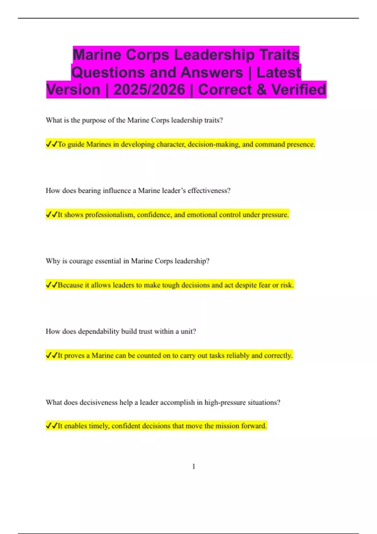Marine Corps Leadership Traits Questions and Answers | Latest Version | 2025/2026 | Correct & Verified What is the purpose of the Marine Corps leadership traits? To guide Marines in developing character, decision-making, and command presence. How does bearing influence a Marine leader’s effectiveness? It shows professionalism, confidence, and emotional control under pressure. Why is courage essential in Marine Corps leadership? Because it allows leaders to make tough decisions and act despite fear or risk. How does dependability build trust within a unit? It proves a Marine can be counted on to carry out tasks reliably and correctly. What does decisiveness help a leader accomplish in high-pressure situations? It enables timely, confident decisions that move the mission forward. 2 Why is endurance important for Marine leaders? Because leadership often requires pushing through mental and physical fatigue. What does enthusiasm look like in an effective Marine leader? A positive attitude, energy in tasks, and motivation that inspires others. How does initiative strengthen leadership at all levels? It empowers Marines to take action without waiting for orders. Why is integrity a cornerstone of Marine leadership? Because honesty and ethical behavior earn respect and set the standard. What does judgment allow leaders to do effectively? Weigh facts, assess risks, and make sound decisions for their unit. How does justice apply to everyday leadership? It ensures fair treatment, discipline, and respect for every Marine. 3 What role does knowledge play in leadership development? It gives leaders the tools to teach, guide, and lead confidently. How does loyalty contribute to unit cohesion? It fosters commitment to peers, subordinates, superiors, and mission. What is tact in the context of Marine Corps leadership? The ability to deliver feedback and lead with respect, even in difficult moments. Why is unselfishness a key leadership trait? Because great leaders prioritize the needs of the team over personal gain. How does a leader show dependability in a combat scenario? By remaining calm, following through, and being where they’re needed most. What effect does a lack of decisiveness have on a unit? It creates confusion, delays action, and weakens trust in leadership. 4 How does bearing influence the perception of a leader? It communicates control, discipline, and readiness without needing to speak. What is one way to develop courage in junior Marines? By placing them in challenging situations with support and guidance. How does enthusiasm affect team performance?