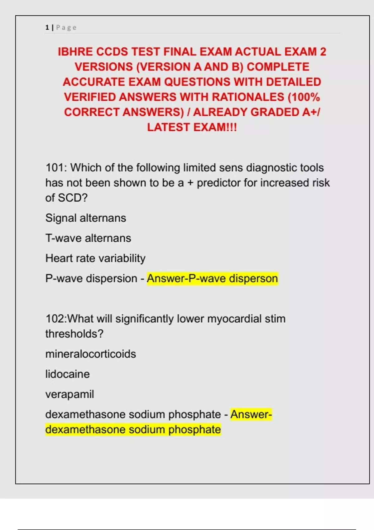 IBHRE CCDS TEST FINAL EXAM ACTUAL EXAM 2 VERSIONS (VERSION A AND B) COMPLETE ACCURATE EXAM QUESTIONS WITH DETAILED VERIFIED ANSWERS WITH RATIONALES (100% CORRECT ANSWERS) / ALREADY GRADED A+/ LATEST EXAM!!!