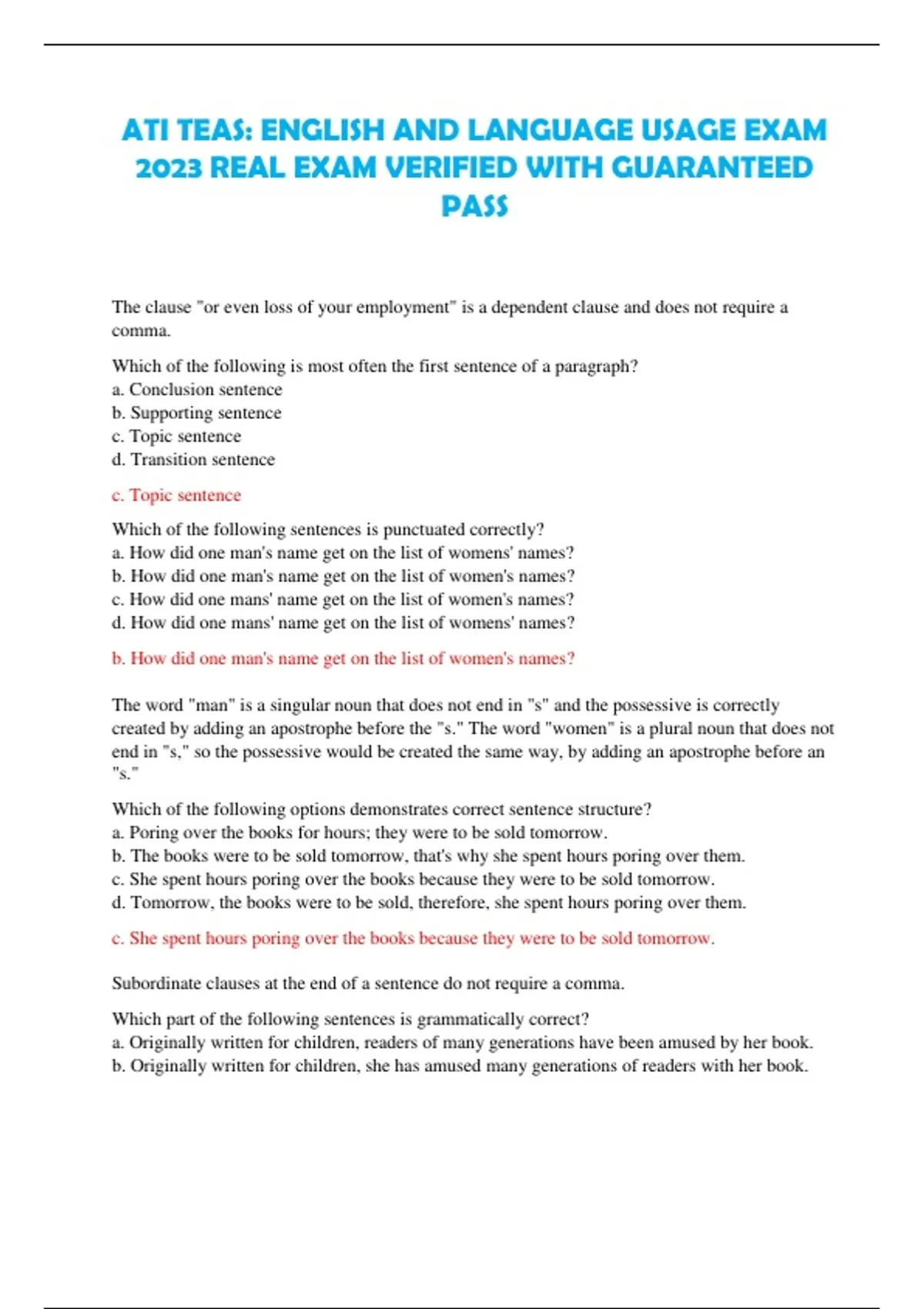 ATI TEAS: ENGLISH AND LANGUAGE USAGE EXAM 2023 REAL EXAM VERIFIED WITH GUARANTEED PASS