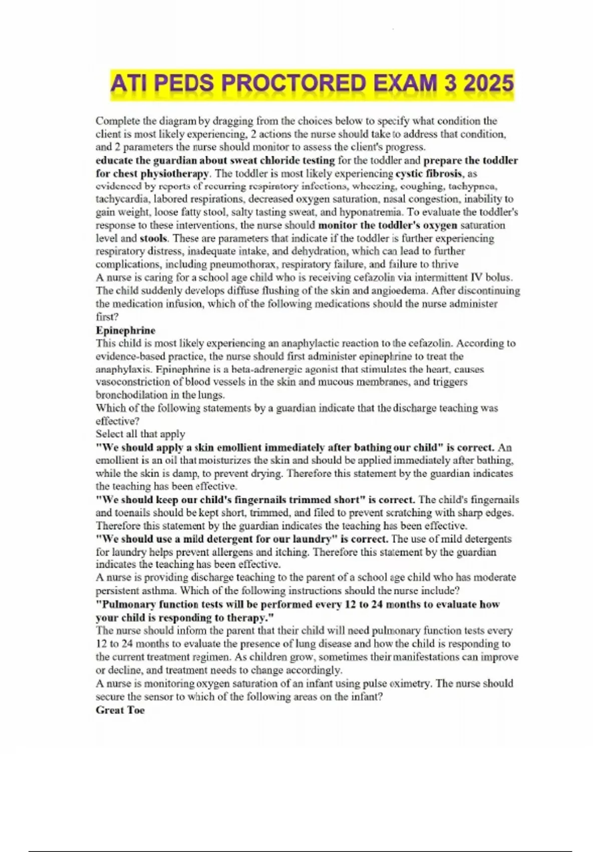 This document provides a comprehensive collection of questions and verified answers from the ATI Pediatrics Proctored Exam 3. It includes clinically relevant multiple-choice items covering pediatric health conditions, nursing assessments, patient education, and safety practices. The material is structured for self-testing and revision, making it an effective resource for nursing students preparing for ATI proctored exams and the pediatric section of the NCLEX
