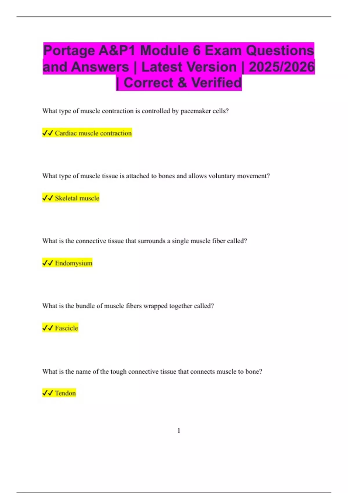 Portage A&P1 Module 6 Exam Questions and Answers | Latest Version | 2025/2026 | Correct & Verified What type of muscle contraction is controlled by pacemaker cells? Cardiac muscle contraction What type of muscle tissue is attached to bones and allows voluntary movement? Skeletal muscle What is the connective tissue that surrounds a single muscle fiber called? Endomysium What is the bundle of muscle fibers wrapped together called? Fascicle What is the name of the tough connective tissue that connects muscle to bone? Tendon 2 What is the basic functional unit of a muscle fiber? Sarcomere What two proteins slide past each other during muscle contraction? Actin and myosin What ion is necessary to initiate muscle contraction? Calcium What molecule provides immediate energy for muscle contraction? ATP What is released by the sarcoplasmic reticulum to trigger muscle contraction? Calcium ions What is the name of the neurotransmitter that stimulates skeletal muscle contraction? Acetylcholine 3 What structure carries the action potential deep into the muscle fiber? T-tubule What enzyme breaks down acetylcholine at the neuromuscular junction? Acetylcholinesterase What type of respiration produces the most ATP in muscle cells? Aerobic respiration What condition results from a lack of ATP in muscle fibers after death? Rigor mortis What is the name of the junction where a motor neuron meets a muscle fiber? Neuromuscular junction What part of the muscle fiber stores calcium? Sarcoplasmic reticulum