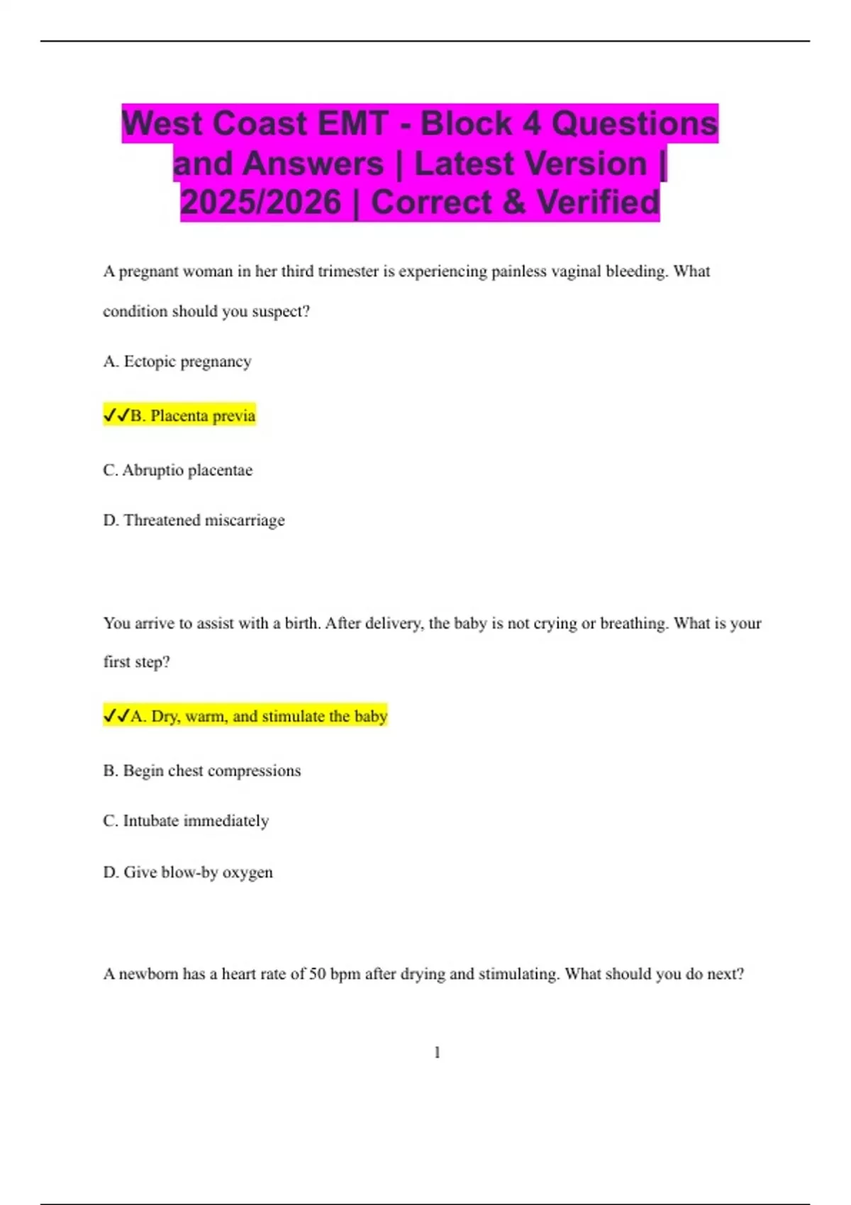 West Coast EMT - Block 4 Questions and Answers | Latest Version | 2025/2026 | Correct & Verified A pregnant woman in her third trimester is experiencing painless vaginal bleeding. What condition should you suspect? A. Ectopic pregnancy B. Placenta previa C. Abruptio placentae D. Threatened miscarriage You arrive to assist with a birth. After delivery, the baby is not crying or breathing. What is your first step? A. Dry, warm, and stimulate the baby B. Begin chest compressions C. Intubate immediately D. Give blow-by oxygen A newborn has a heart rate of 50 bpm after drying and stimulating. What should you do next? 2 A. Continue stimulation for one more minute B. Give oxygen via nasal cannula C. Begin chest compressions and ventilations D. Give oral glucose What does crowning mean during childbirth? A. The baby's head has turned B. The placenta is visible C. The baby’s head is visible at the vaginal opening D. The water has broken You are called for a 2-year-old with stridor and a barking cough. What condition do you suspect? A. Asthma B. Croup C. Pneumonia D. Foreign body obstruction Which of the following is a common sign of child abuse? 3 A. Fever and cough B. Multiple bruises in various stages of healing C. Loud crying D. Vomiting after eating What is the proper way to open an infant’s airway for ventilations? A. Use a neutral head position B. Use a head-tilt, chin-lift fully C. Perform a jaw-thrust only D. Extend the neck backward You deliver a baby and observe meconium-stained fluid. The baby is not crying or breathing. What should you do? A. Suction the mouth and nose before ventilating B. Perform CPR immediately C. Call for ALS backup and wait D. Give blow-by oxygen only 4 A pregnant woman in her second trimester is involved in a car accident. She complains of abdominal pain. What should you suspect? A. Labor B. Preeclampsia C. Abruptio placentae D. Placenta previa A child with a high fever suddenly begins having a generalized seizure. What’s the likely cause? A. Low blood sugar B. Febrile seizure C. Epilepsy D. Child abuse Which age group is most likely to have separation anxiety during EMS treatment? A. Newborns B. Adolescents