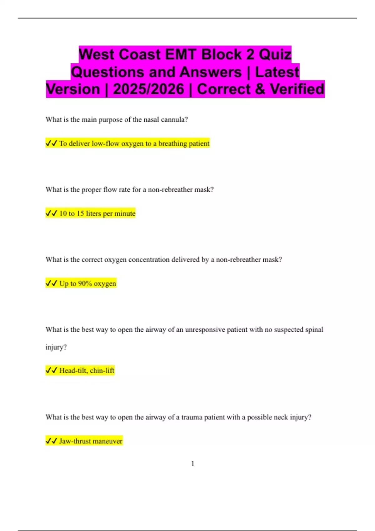 West Coast EMT Block 2 Quiz Questions and Answers | Latest Version | 2025/2026 | Correct & Verified What is the main purpose of the nasal cannula? To deliver low-flow oxygen to a breathing patient What is the proper flow rate for a non-rebreather mask? 10 to 15 liters per minute What is the correct oxygen concentration delivered by a non-rebreather mask? Up to 90% oxygen What is the best way to open the airway of an unresponsive patient with no suspected spinal injury? Head-tilt, chin-lift What is the best way to open the airway of a trauma patient with a possible neck injury? Jaw-thrust maneuver 2 What is the function of the epiglottis? To prevent food and liquid from entering the airway What is the normal adult respiratory rate? 12 to 20 breaths per minute What does gurgling sound in the airway indicate? The presence of fluid in the upper airway What should you do immediately if you hear gurgling in a patient’s airway? Suction the airway What is the function of the alveoli in the lungs? Gas exchange between oxygen and carbon dioxide What is the most effective way to ventilate an apneic adult with a pulse? Use a bag-valve mask (BVM) with oxygen 3 What is the appropriate rate to ventilate an adult patient with a BVM? One breath every 5 to 6 seconds What is the appropriate rate to ventilate a child with a BVM? One breath every 3 to 5 seconds What is the appropriate rate to ventilate an infant with a BVM? One breath every 3 to 5 seconds What device is used to clear secretions or vomit from the airway? Suction unit How long should you suction an adult patient's airway at a time? No more than 15 seconds