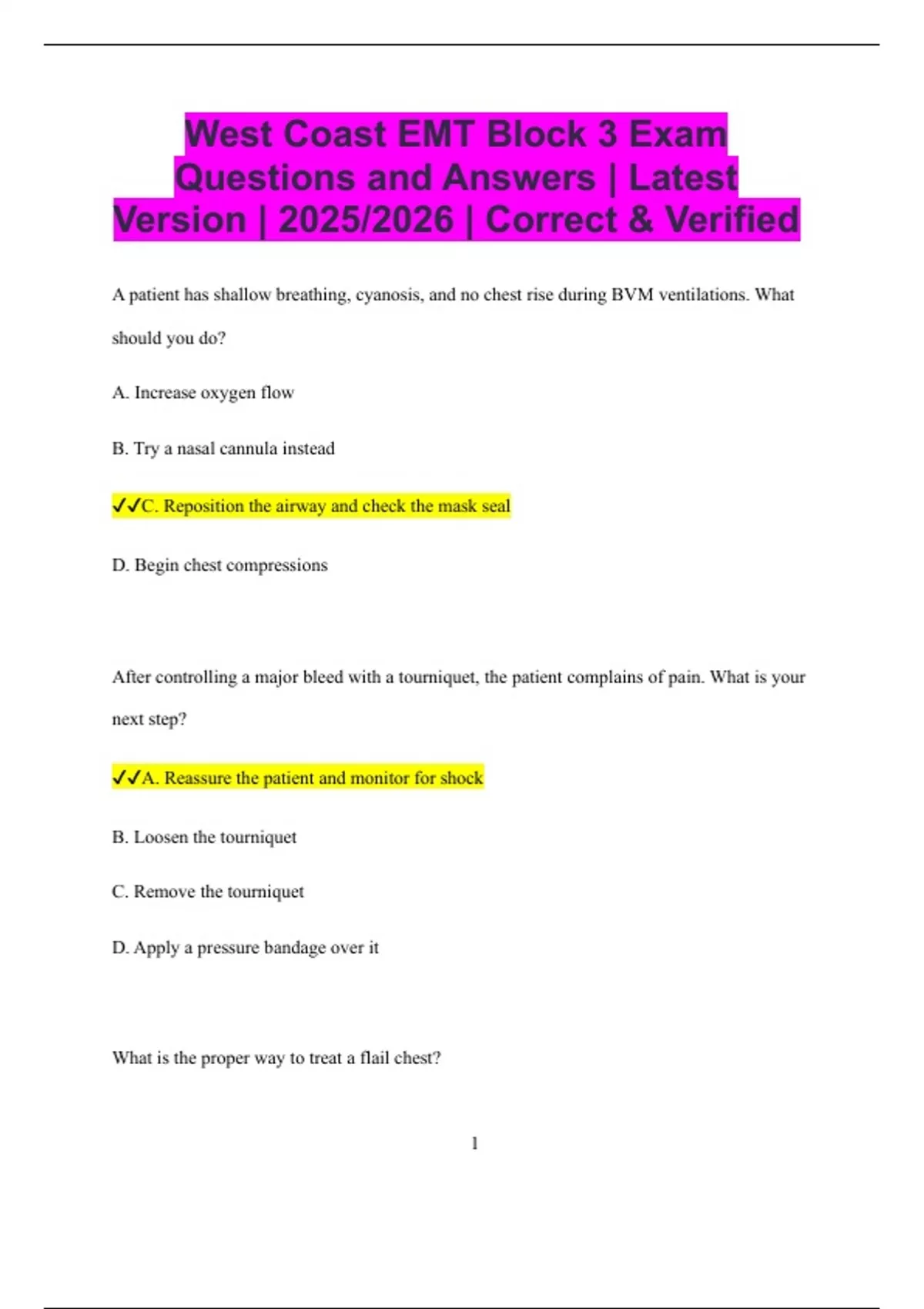 West Coast EMT Block 3 Exam Questions and Answers | Latest Version | 2025/2026 | Correct & Verified A patient has shallow breathing, cyanosis, and no chest rise during BVM ventilations. What should you do? A. Increase oxygen flow B. Try a nasal cannula instead C. Reposition the airway and check the mask seal D. Begin chest compressions After controlling a major bleed with a tourniquet, the patient complains of pain. What is your next step? A. Reassure the patient and monitor for shock B. Loosen the tourniquet C. Remove the tourniquet D. Apply a pressure bandage over it What is the proper way to treat a flail chest? 2 A. Wrap the chest tightly with a bandage B. Provide high-flow oxygen and support ventilation if needed C. Tape the ribs D. Place the patient prone A patient was struck in the head and now has a decreasing level of consciousness and a slow pulse. What should you suspect? A. Stroke B. Increased intracranial pressure C. Seizure D. Hypoglycemia A patient presents with snoring respirations after a fall. What should you do immediately? A. Provide oxygen by non-rebreather B. Begin chest compressions C. Open the airway with jaw-thrust D. Administer glucose 3 A construction worker fell from a ladder and is breathing irregularly. What should you suspect? A. Spinal injury B. Cardiac arrest C. Stroke D. Allergic reaction You arrive to find a man with severe bleeding from his thigh. Direct pressure has failed. What is the next step? A. Apply a tourniquet above the wound B. Elevate the leg C. Apply cold packs D. Wrap it tightly in gauze