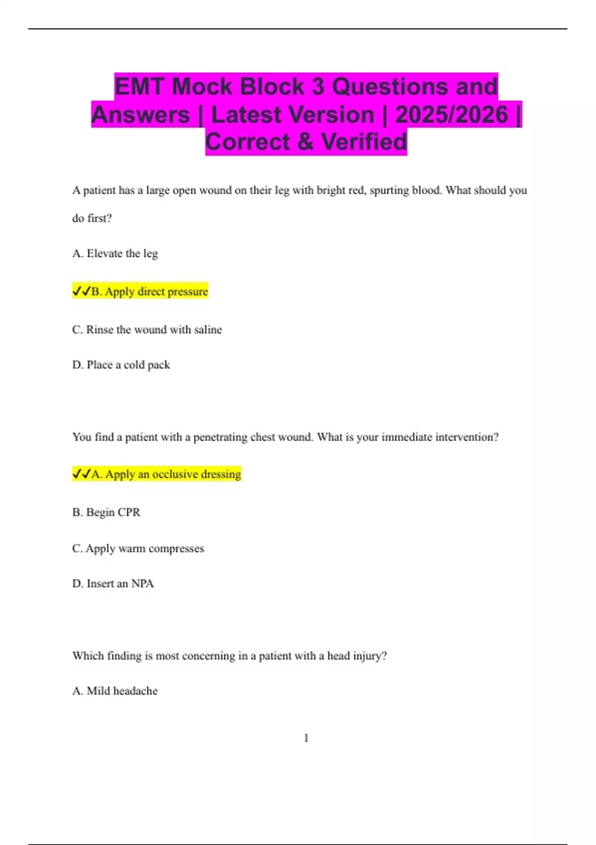 EMT Mock Block 3 Questions and Answers | Latest Version | 2025/2026 | Correct & Verified A patient has a large open wound on their leg with bright red, spurting blood. What should you do first? A. Elevate the leg B. Apply direct pressure C. Rinse the wound with saline D. Place a cold pack You find a patient with a penetrating chest wound. What is your immediate intervention? A. Apply an occlusive dressing B. Begin CPR C. Apply warm compresses D. Insert an NPA Which finding is most concerning in a patient with a head injury? A. Mild headache 2 B. Bruising on the arm C. Unequal pupils D. Slight confusion A patient is breathing 6 times per minute and has a pulse of 40 bpm after a drug overdose. What should you do first? A. Suction the airway B. Begin assisted ventilations with a BVM C. Start chest compressions D. Administer oral glucose What is the purpose of the jaw-thrust maneuver? A. To stop bleeding B. To stabilize the neck C. To open the airway in a trauma patient D. To deliver oxygen 3 You are treating a man found unconscious after falling from a roof. His breathing is noisy and gurgling. What should you do first? A. Apply a cervical collar B. Insert an OPA C. Suction the airway D. Start positive pressure ventilation A woman was stung by a bee and is now developing hives and wheezing. What should you suspect? A. Anaphylaxis B. Asthma C. Heart attack D. Stroke A child with a high fever is seizing. What is your priority? A. Protect the airway and prevent injury B. Place the child in cold water C. Give them fluids 4 D. Insert an OPA What is the best position for a patient with signs of shock and no spinal trauma? A. Sitting upright B. Supine with legs elevated C. Recovery position D. Prone A burn patient has singed nasal hairs, soot around the mouth, and difficulty speaking. What is the biggest concern? A. Airway swelling B. Dehydration C. Internal bleeding D. Fractures A patient is found pulseless and not breathing after being struck by lightning. What should you do? A. Check blood pressure