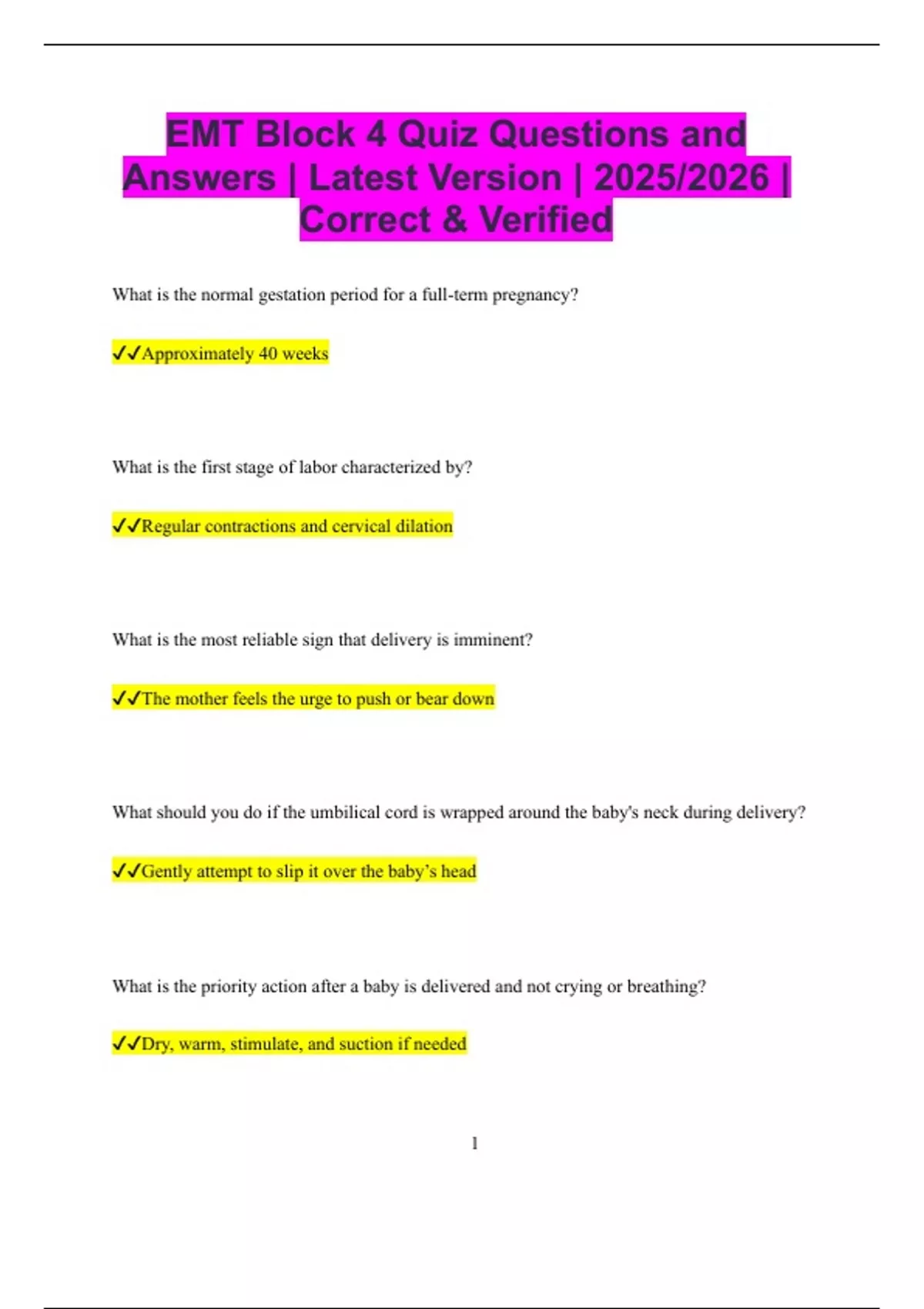 EMT Block 4 Quiz Questions and Answers | Latest Version | 2025/2026 | Correct & Verified