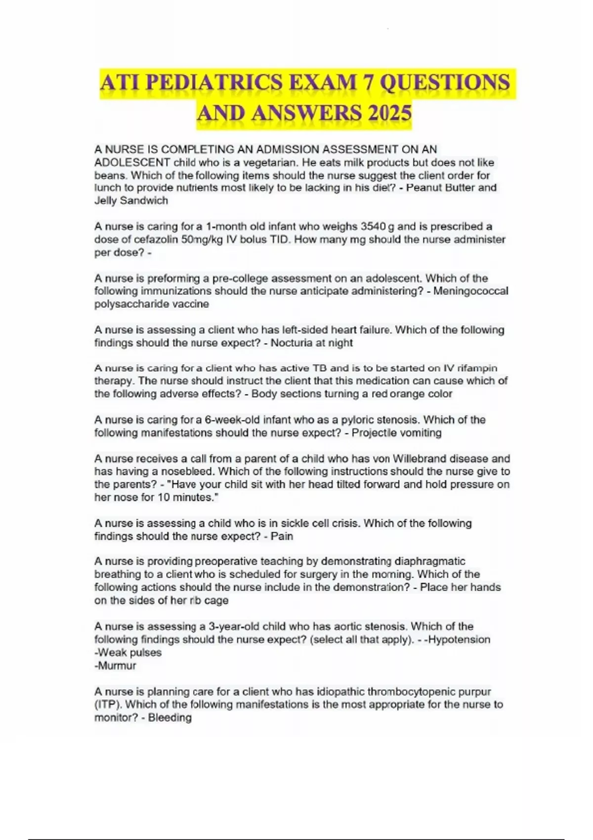 This document contains the full set of ATI Pediatrics Exam 7 questions and correct answers, specifically designed for the 2025 exam cycle. It includes high-yield pediatric nursing topics such as developmental stages, pediatric pathophysiology, growth assessments, immunization protocols, medication safety in children, family teaching, and therapeutic communication strategies. This resource is ideal for students preparing for ATI pediatric assessments or clinical evaluations