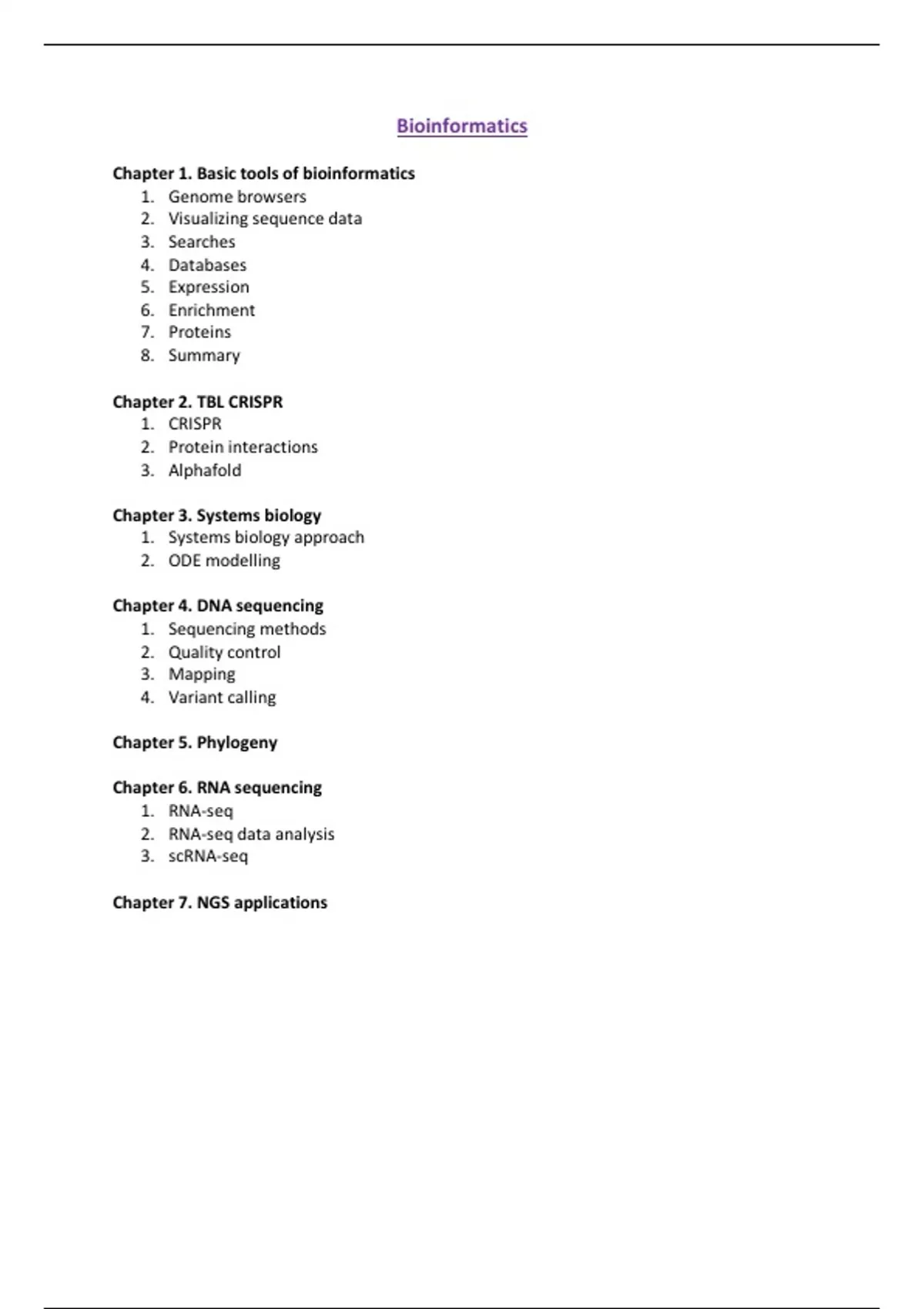 This document covers everything there is to know about bioinformatics. Chapter 1 discusses the basic tools of bioinformatics, including genome browsers, enrichment tools, and databases. Chapter 2 focuses on TBL CRISPR, covering CRISPR, protein interactions, and Alphafold. Chapter 3 introduces systems biology, including ODE modeling. Chapter 4 explains DNA sequencing, covering sequencing methods, quality control, mapping, and variant calling. Chapter 5 discusses Phylogeny, Chapter 6 covers RNA sequencing, and the last chapter explores NGS applications.