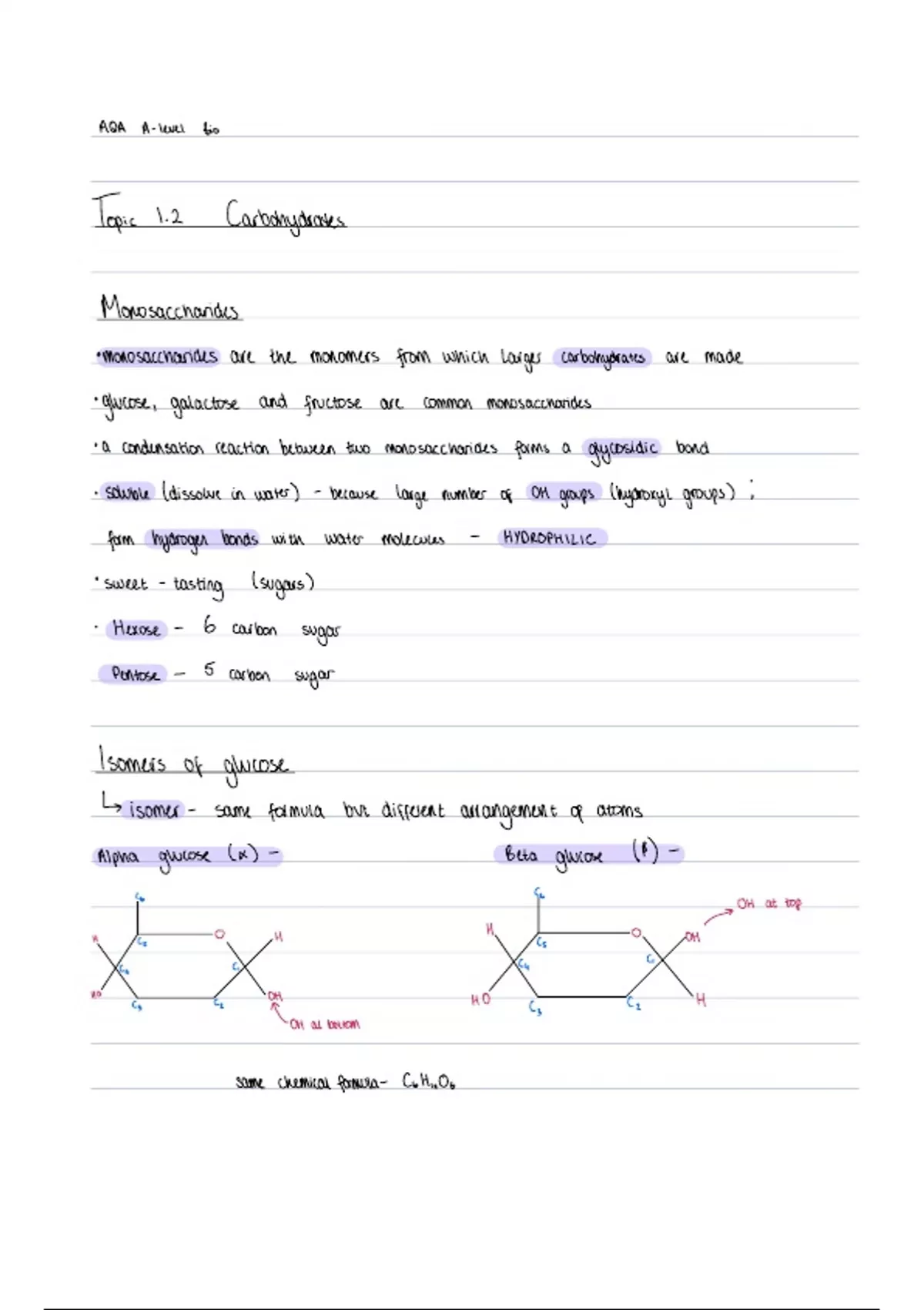 AQA A Level Biology Unit 1, Topic 1.2 Carbohydrates detailed notes