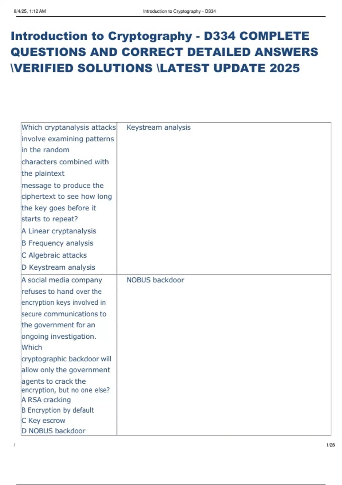 Introduction to Cryptography - D334 COMPLETE