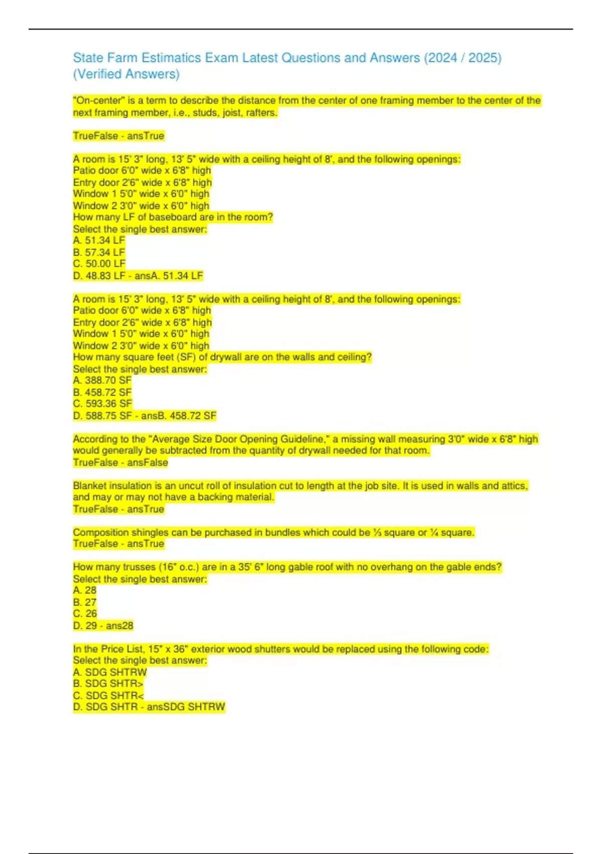 , State Farm Estimatics Exam Latest Questions and Answers ()