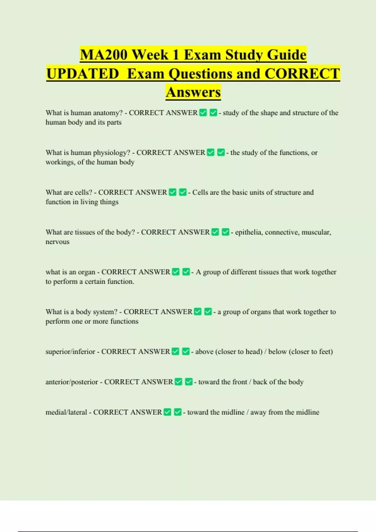 MA200 Week 1 Exam Study Guide UPDATED Exam Questions and CORRECT Answers What is human anatomy? - CORRECT ANSWER human body and its parts What is human physiology? - CORRECT ANSWER workings, of the human body What are cells? - CORRECT ANSWER - study of the shape and structure of the - the study of the functions, or - Cells are the basic units of structure and function in living things What are tissues of the body? - CORRECT ANSWER nervous what is an organ - CORRECT ANSWER - epithelia, connectiv