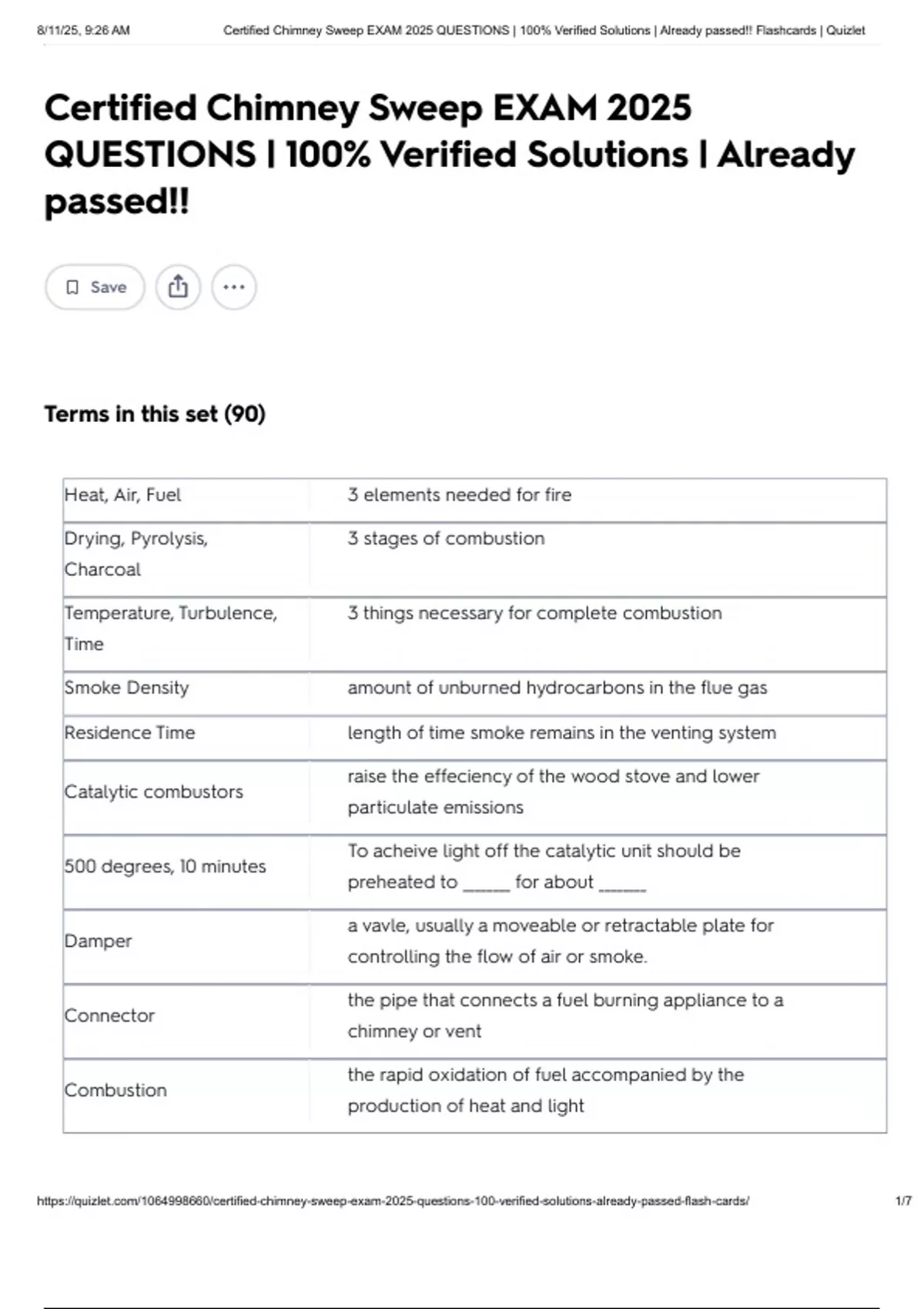 , 8/11/25, 9:26 AM Certified Chimney Sweep EXAM 2025 QUESTIONS | 100% Verified Solutions | Already passed!! Flashcards | Quizlet
