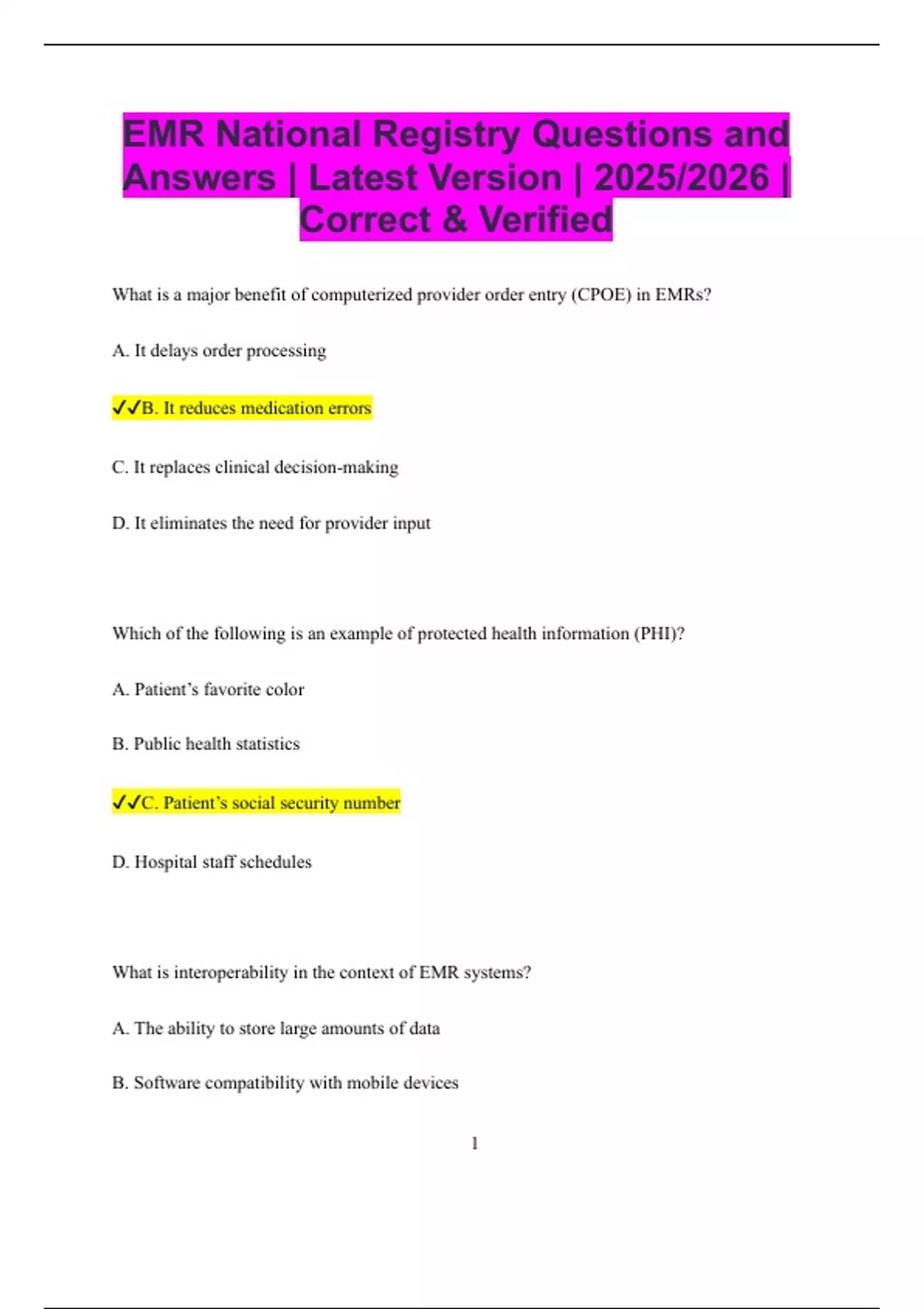 EMR National Registry Questions and Answers | Latest Version | 2025/2026 | Correct & Verified What is a major benefit of computerized provider order entry (CPOE) in EMRs? A. It delays order processing B. It reduces medication errors C. It replaces clinical decision-making D. It eliminates the need for provider input Which of the following is an example of protected health information (PHI)? A. Patient’s favorite color B. Public health statistics C. Patient’s social security number D. Hospital staff schedules What is interoperability in the context of EMR systems? A. The ability to store large amounts of data B. Software compatibility with mobile devices 2 C. The ability of different health information systems to exchange and use data D. User-friendly interface design Which method helps secure EMR data from unauthorized access? A. Automatic data deletion B. Use of public Wi-Fi networks C. Multi-factor authentication D. Sharing passwords What is the role of clinical decision support systems (CDSS) within an EMR? A. To replace healthcare providers B. To provide alerts and guidance based on patient data C. To schedule patient appointments D. To generate billing codes automatically Which of the following is a common challenge during EMR implementation? A. Immediate cost savings B. Workflow disruption and staff resistance 3 C. Elimination of all errors D. Decreased documentation requirements What type of alert might a provider receive during medication ordering in an EMR? A. Reminder to update software B. Insurance claim status C. Warning of a drug interaction or allergy D. Patient satisfaction score What is a key advantage of using templates in EMR documentation? A. Slower documentation B. Improved standardization and efficiency C. Increased data errors D. Limiting clinical information Which healthcare professionals can access a patient’s EMR? A. Only physicians B. Only nurses 4 C. Authorized healthcare providers involved in patient care D. Hospital administration only What is the function of an audit trail in an EMR system? A. Deleting old patient data B. Tracking who accessed or modified patient records C. Scheduling appointments D. Generating insurance claims What is the purpose of patient portals linked to EMRs? A. To allow unauthorized data sharing B. To provide patients with access to their health information and communication tools C. To replace office visits D. To automate billing payments Which of the following is a common security risk for EMRs? A. Strong encryption B. Phishing attacks and unauthorized