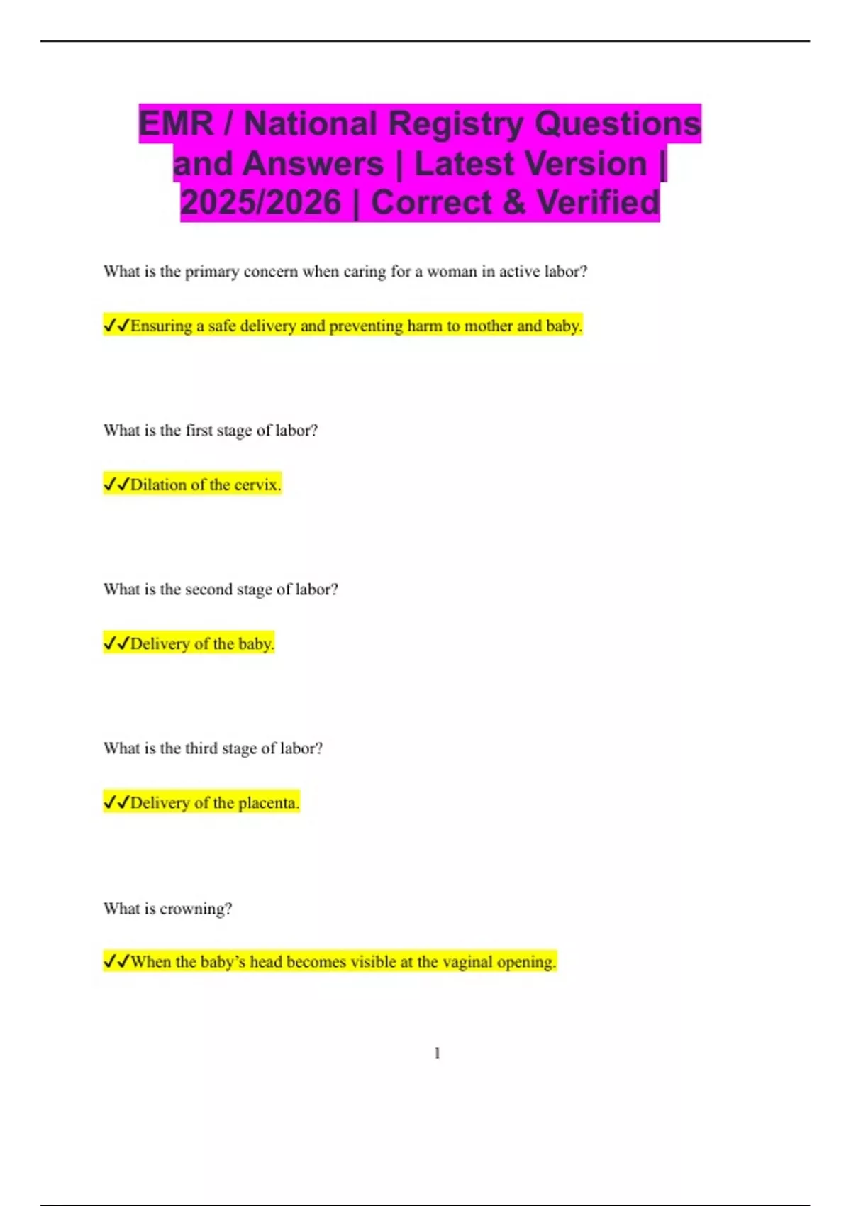 EMR / National Registry Questions and Answers | Latest Version | 2025/2026 | Correct & Verified What is the primary concern when caring for a woman in active labor? Ensuring a safe delivery and preventing harm to mother and baby. What is the first stage of labor? Dilation of the cervix. What is the second stage of labor? Delivery of the baby. What is the third stage of labor? Delivery of the placenta. What is crowning? When the baby’s head becomes visible at the vaginal opening. 2 What is the normal gestation period for a pregnancy? About 40 weeks. What should you do if the amniotic sac has not ruptured when the baby’s head delivers? Tear it open carefully to allow the baby to breathe. What is the first thing to check immediately after a newborn is delivered? Airway and breathing. What is the normal respiratory rate for a newborn? 40 to 60 breaths per minute. What is the normal heart rate for a newborn? 120 to 160 beats per minute. What should you do if a newborn is not breathing after birth? Begin ventilation with a bag-valve mask. 3 What is the term for a delivery that occurs before 37 weeks of pregnancy? Premature birth. What is meconium? The baby’s first stool, sometimes present in amniotic fluid. What should you do if meconium is present and the newborn is not breathing? Suction the airway before providing ventilation. What is the APGAR score used for? Assessing a newborn’s condition after birth. What are the five APGAR components? Appearance, Pulse, Grimace, Activity, Respiration. What is the normal APGAR score range for a healthy newborn? 7 to 10. 4 What should you do if a newborn’s heart rate is below 60 after drying and stimulating? Begin chest compressions with ventilation. What position should you place a pregnant woman in her third trimester if she is on a backboard? Tilt her to the left to avoid supine hypotensive syndrome. What causes supine hypotensive syndrome? The uterus compresses the vena cava when
