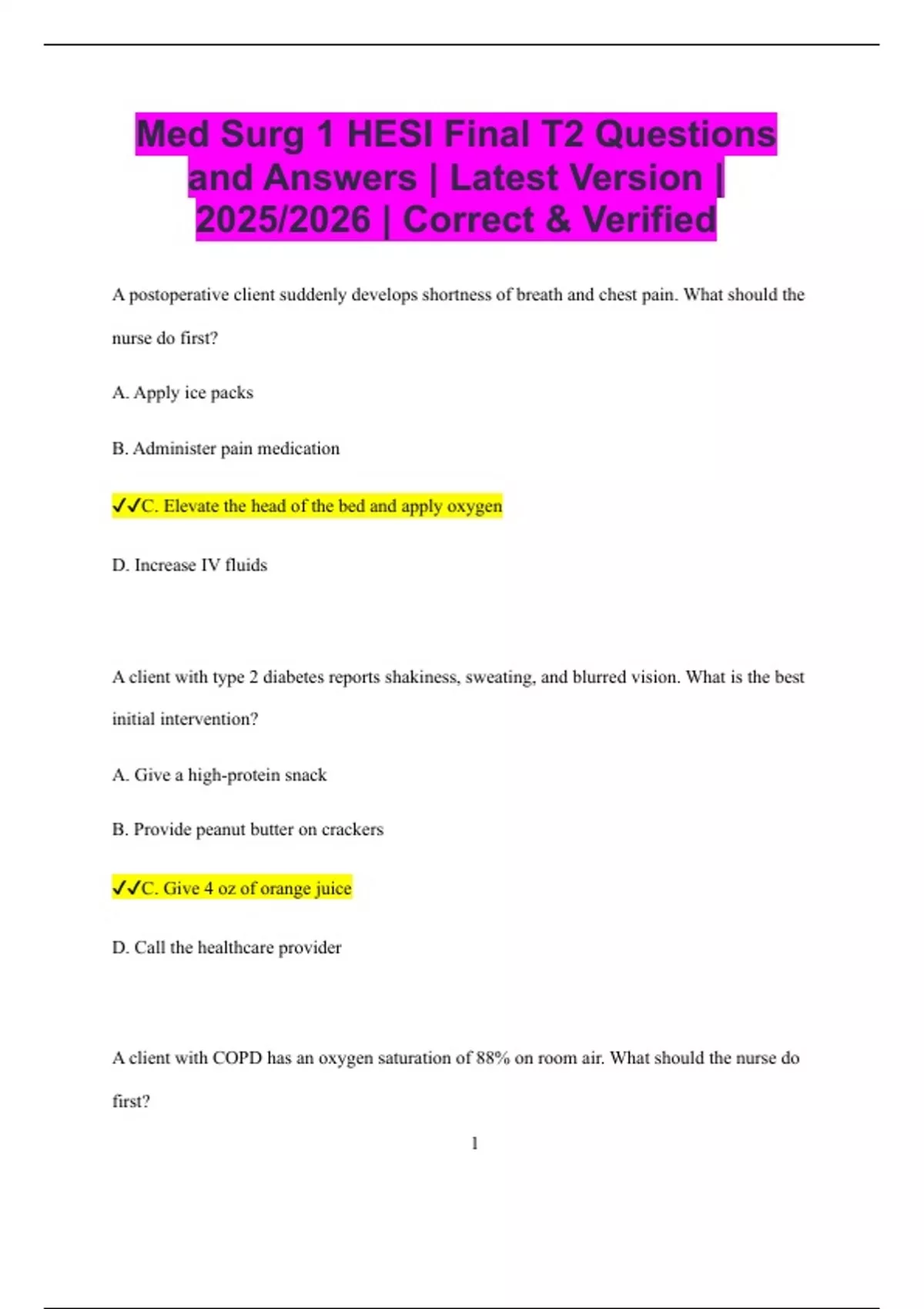 Med Surg 1 HESI Final T2 Questions and Answers | Latest Version | 2025/2026 | Correct & Verified A postoperative client suddenly develops shortness of breath and chest pain. What should the nurse do first? A. Apply ice packs B. Administer pain medication C. Elevate the head of the bed and apply oxygen D. Increase IV fluids A client with type 2 diabetes reports shakiness, sweating, and blurred vision. What is the best initial intervention? A. Give a high-protein snack B. Provide peanut butter on crackers C. Give 4 oz of orange juice D. Call the healthcare provider A client with COPD has an oxygen saturation of 88% on room air. What should the nurse do first? 2 A. Increase oxygen to 6 L/min via nasal cannula B. Encourage pursed-lip breathing C. Place the client in the supine position D. Reduce physical activity for the day A client with cirrhosis develops confusion and lethargy. Which lab result is most important for the nurse to review? A. Sodium level B. Ammonia level C. Potassium level D. Albumin level A client receiving digoxin has an apical pulse of 54 beats/min. What is the nurse’s best action? A. Hold the dose and notify the healthcare provider B. Give the medication with food C. Recheck the pulse in 10 minutes D. Encourage fluid intake 3 A nurse is caring for a client post-thyroidectomy who has noisy breathing and difficulty speaking. What is the priority? A. Offer ice chips B. Reassure the client C. Notify the healthcare provider immediately D. Encourage coughing and deep breathing A client is admitted with a diagnosis of deep vein thrombosis in the left leg. Which nursing intervention is most important? A. Apply warm compresses to the affected leg B. Maintain bed rest and elevate the leg C. Massage the affected calf D. Encourage walking every hour A client with a chest tube has gentle tidaling in the water-seal chamber. What should the nurse do? A. Clamp the tube immediately B. Document the finding as normal C. Notify the provider 4 D. Increase suction A client with a stroke has difficulty swallowing. Which action is most important for the nurse? A. Provide thin liquids with a straw B. Encourage rapid eating C. Place food on the unaffected side of the mouth D. Offer large bites of food A client undergoing blood transfusion develops chills, fever, and back pain. What is the nurse’s first action? A. Slow the transfusion rate B. Stop the transfusion C. Notify the laboratory D. Administer antihistamines A client with pneumonia has thick, tenacious sputum. Which action should the nurse encourage? A. Restrict fluids B. Increase oral fluid intake