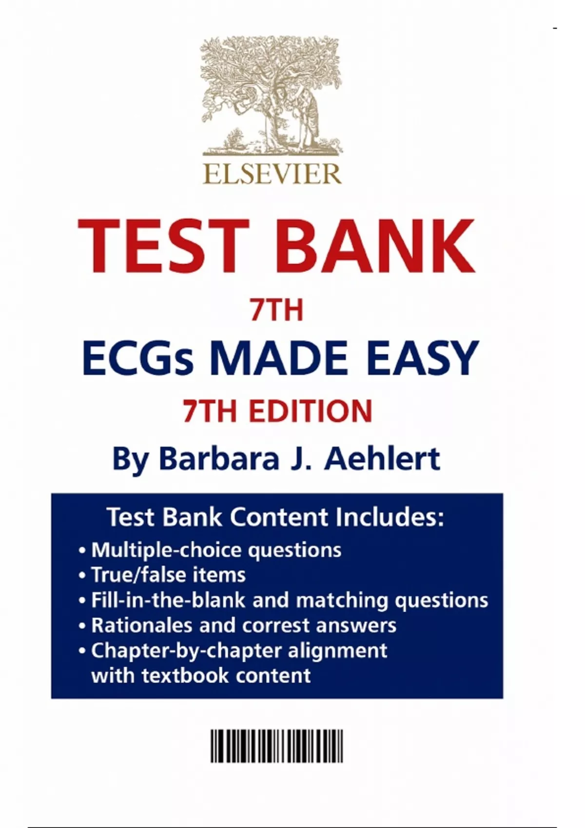 The Test Bank for ECGs Made Easy (7th Edition, Barbara J. Aehlert) provides a complete collection of multiple-choice, true/false, matching, and rhythm-interpretation questions with correct answers and detailed explanations for all chapters. It covers essential ECG concepts including cardiac anatomy and physiology, the cardiac cycle, ECG waveforms, lead placement, rhythm analysis, sinus rhythms, atrial rhythms, junctional rhythms, ventricular rhythms, heart blocks, and pacemaker rhythms. Additional chapters address ECG changes associated with myocardial infarction, electrolyte imbalances, and other clinical conditions. Designed for paramedic, nursing, and allied health students, this test bank is an excellent resource for mastering ECG interpretation skills and preparing for both classroom and certification exams.