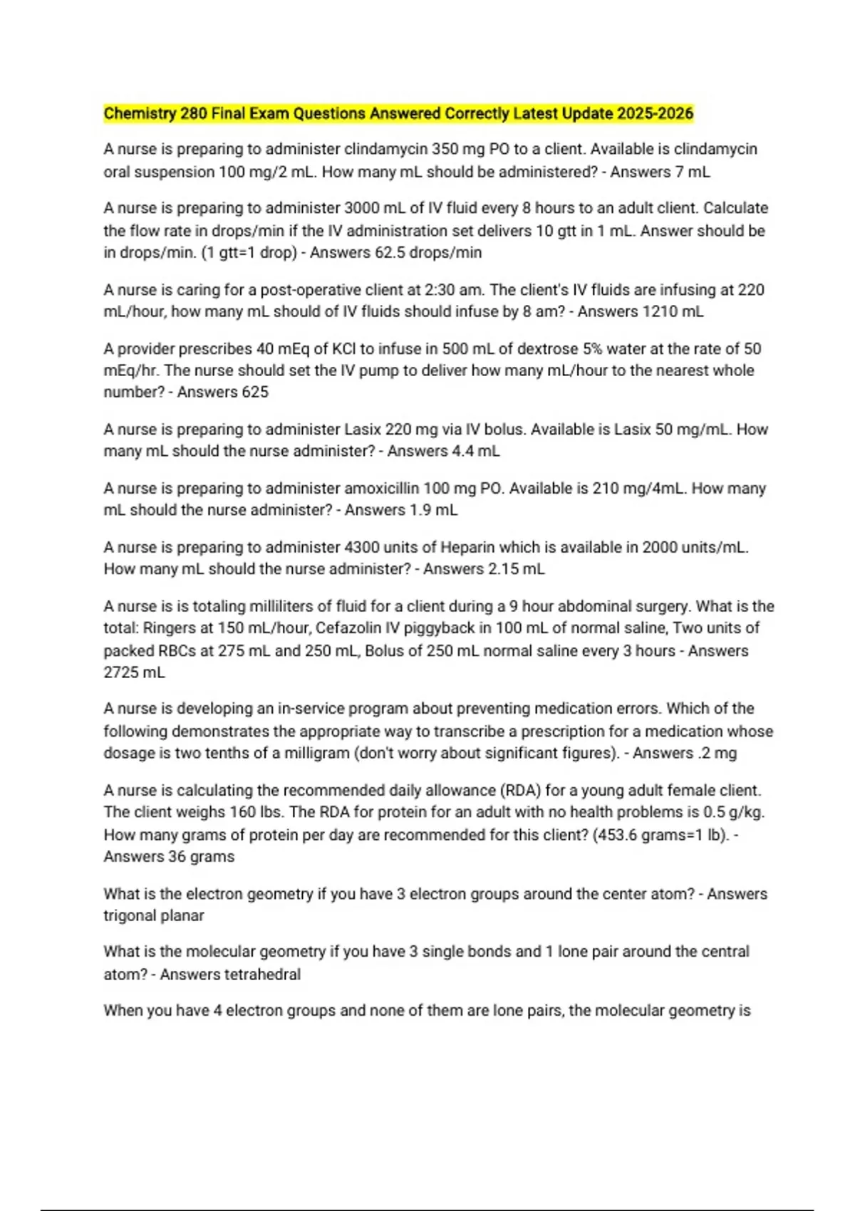 Chemistry 280 Final Exam Questions Answered Correctly Latest Update A nurse is preparing to administer clindamycin 350 mg PO to a client. Available is clindamycin oral suspension 100 mg/2 mL. How many mL should be administered? - Answers 7 mL A nurse is preparing to administer 3000 mL of IV fluid every 8 hours to an adult client. Calculate the flow rate in drops/min if the IV administration set delivers 10 gtt in 1 mL. Answer should be in drops/min. (1 gtt=1 drop) - Answers 62.5 drops/min A nurse is caring for a post-operative client at 2:30 am. The client's IV fluids are infusing at 220 mL/hour, how many mL should of IV fluids should infuse by 8 am? - Answers 1210 mL A provider prescribes 40 mEq of KCl to infuse in 500 mL of dextrose 5% water at the rate of 50 mEq/hr. The nurse should set the IV pump to deliver how many mL/hour to the nearest whole number? - Answers 625 A nurse is preparing to administer Lasix 220 mg via IV bolus. Available is Lasix 50 mg/mL. How many mL should the nurse administer? - Answers 4.4 mL A nurse is preparing to administer amoxicillin 100 mg PO. Available is 210 mg/4mL. How many mL should the nurse administer? - Answers 1.9 mL A nurse is preparing to administer 4300 units of Heparin which is available in 2000 units/mL. How many mL should the nurse administer? - Answers 2.15 mL A nurse is is totaling milliliters of fluid for a client during a 9 hour abdominal surgery. What is the total: Ringers at 150 mL/hour, Cefazolin IV piggyback in 100 mL of normal saline, Two units of packed RBCs at 275 mL and 250 mL, Bolus of 250 mL normal saline every 3 hours - Answers 2725 mL A nurse is developing an in-service program about preventing medication errors. Which of the following demonstrates the appropriate way to transcribe a prescription for a medication whose dosage is two tenths of a milligram (don't worry about significant figures). - Answers .2 mg A nurse is calculating the recommended daily allowance (RDA) for a young adult female client. The client weighs 160 lbs. The RDA for protein for an adult with no health problems is 0.5 g/kg. How many grams of protein per day are recommended for this client? (453.6 grams=1 lb). - Answers 36 grams What is the electron geometry if you have 3 electron groups around the center atom? - Answers trigonal planar What is the molecular geometry if you have 3 single bonds and 1 lone pair around the central atom? - Answers tetrahedral When you have 4 electron groups and none of them are lone pairs, the molecular geometry is trigonal pyramidal. - Answers False What is the molecular geometry of CCl4? - Answers tetrahedral What is the correct Lewis structure for N2? - Answers : N ≡ N : What is the molecular geometry of SiH4? - Answers tetrahedral A 5.00 liter balloon of gas at 25°C is cooled to 0°C. What is the new volume (liters) of the balloon? - Answers 4.58 liters