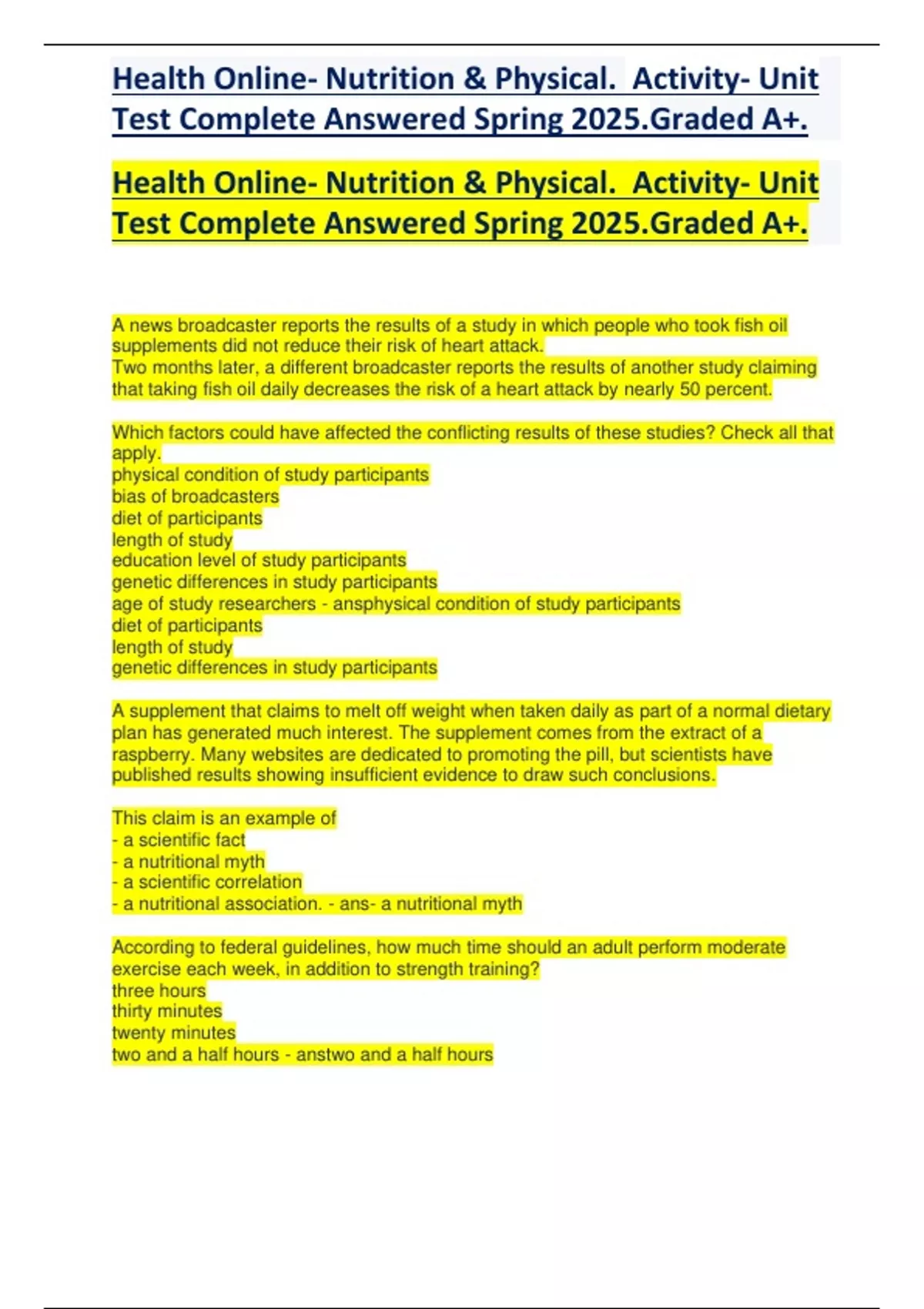 Health Online- Nutrition & Physical. Activity- Unit Test Complete Answered Spring 2025.Graded A+..pdf