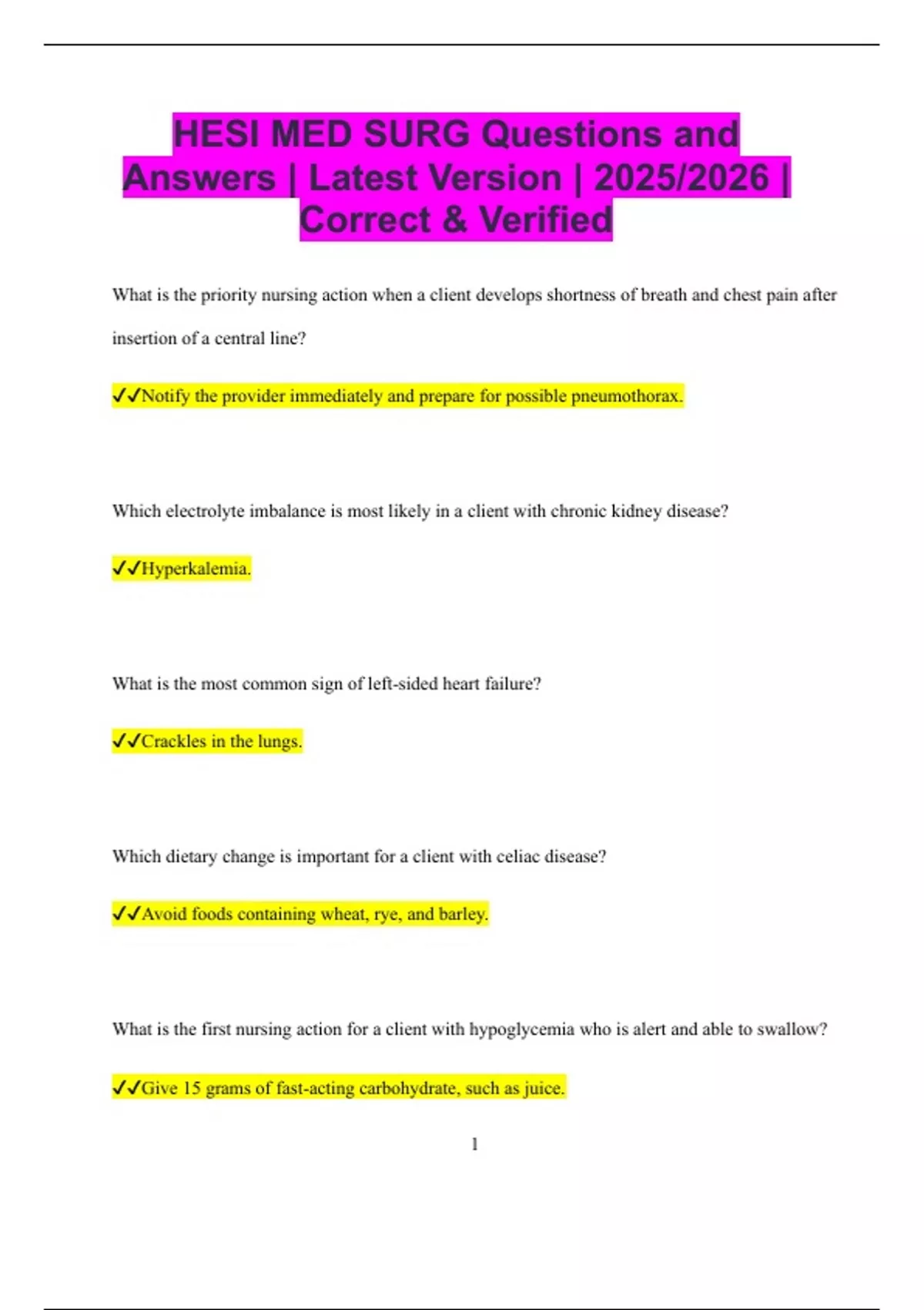 HESI MED SURG Questions and Answers | Latest Version | 2025/2026 | Correct & Verified What is the priority nursing action when a client develops shortness of breath and chest pain after insertion of a central line? Notify the provider immediately and prepare for possible pneumothorax. Which electrolyte imbalance is most likely in a client with chronic kidney disease? Hyperkalemia. What is the most common sign of left-sided heart failure? Crackles in the lungs. Which dietary change is important for a client with celiac disease? Avoid foods containing wheat, rye, and barley. What is the first nursing action for a client with hypoglycemia who is alert and able to swallow? Give 15 grams of fast-acting carbohydrate, such as juice. 2 What finding should be reported immediately in a client after thyroidectomy? Stridor or difficulty breathing. Which position helps reduce intracranial pressure? Head of bed elevated to 30 degrees. What is the best nursing action for a client with a dislodged tracheostomy tube? Insert the obturator and replace the tube. What is the expected stool characteristic in a client with a new ileostomy? Liquid stool. What is the most important teaching point for a client taking warfarin? Monitor INR regularly and avoid excessive vitamin K intake. What is the nurse’s first action when a blood transfusion reaction is suspected? Stop the transfusion immediately. 3 Which symptom is common in a client with hypocalcemia? Positive Chvostek’s sign. What is the priority action when a chest tube becomes disconnected from the drainage system? Place the tube in sterile water to maintain the water seal. What is the primary purpose of an incentive spirometer after surgery? Prevent atelectasis. Which lab value should be monitored closely for a client taking furosemide? Potassium. What should the nurse do if a client with COPD becomes suddenly restless and confused? Assess oxygen saturation and increase oxygen if needed. Which type of isolation is required for a client with tuberculosis? Airborne precautions. 4 What is the most important dietary restriction for a client with heart failure? Low sodium diet. What is the nurse’s best initial action for a client with suspected hypovolemic shock? Place the client in a supine position with legs elevated. What symptom should be reported immediately in a client receiving