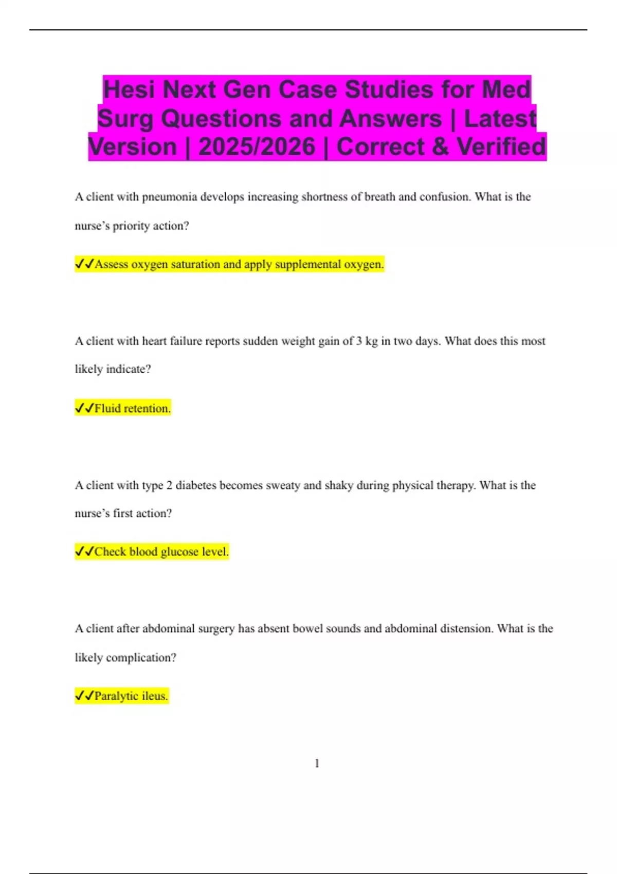 Hesi Next Gen Case Studies for Med Surg Questions and Answers | Latest Version | 2025/2026 | Correct & Verified A client with pneumonia develops increasing shortness of breath and confusion. What is the nurse’s priority action? Assess oxygen saturation and apply supplemental oxygen. A client with heart failure reports sudden weight gain of 3 kg in two days. What does this most likely indicate? Fluid retention. A client with type 2 diabetes becomes sweaty and shaky during physical therapy. What is the nurse’s first action? Check blood glucose level. A client after abdominal surgery has absent bowel sounds and abdominal distension. What is the likely complication? Paralytic ileus. 2 A client with chronic kidney disease has a potassium level of 6.5 mEq/L. What is the nurse’s immediate priority? Place the client on a cardiac monitor. A client with COPD becomes increasingly lethargic and has shallow respirations. What should the nurse do first? Assess arterial blood gases. A client post–thyroidectomy reports tingling around the mouth and fingertips. What condition does the nurse suspect? Hypocalcemia. A client receiving IV antibiotics for a wound infection develops watery diarrhea. What condition should the nurse suspect? Clostridioides difficile infection. A client admitted with a stroke has slurred speech and right-sided weakness. What is the nurse’s priority action? Perform a swallow assessment before giving food or fluids. 3 A client with a chest tube shows continuous bubbling in the water seal chamber. What does this indicate? Air leak in the system. A client with sepsis has a blood pressure of 80/50 mmHg despite receiving fluids. What is the next likely intervention? Administration of vasopressors. A client receiving blood transfusion reports chills and back pain. What is the nurse’s immediate action? Stop the transfusion and keep the IV line open with normal saline. A client with diabetic ketoacidosis has a fruity breath odor and rapid respirations. What is the priority nursing intervention? Start IV fluids as prescribed. A client post hip surgery develops sudden shortness