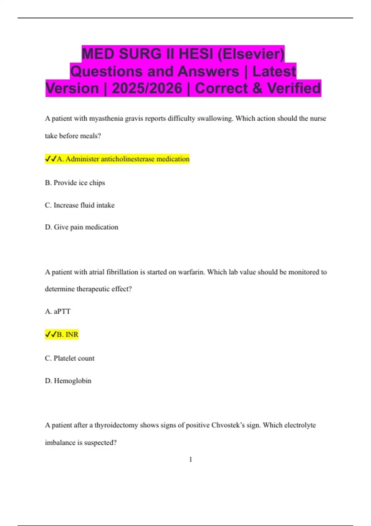 MED SURG II HESI (Elsevier) Questions and Answers | Latest Version | 2025/2026 | Correct & Verified A patient with myasthenia gravis reports difficulty swallowing. Which action should the nurse take before meals? A. Administer anticholinesterase medication B. Provide ice chips C. Increase fluid intake D. Give pain medication A patient with atrial fibrillation is started on warfarin. Which lab value should be monitored to determine therapeutic effect? A. aPTT B. INR C. Platelet count D. Hemoglobin A patient after a thyroidectomy shows signs of positive Chvostek’s sign. Which electrolyte imbalance is suspected? 2 A. Hyperkalemia B. Hypocalcemia C. Hypercalcemia D. Hyponatremia A patient with end-stage renal disease is scheduled for hemodialysis. Which pre-procedure assessment is the priority? A. Assess for bruit and thrill in the fistula B. Measure abdominal girth C. Check blood glucose D. Assess pedal pulses A patient is receiving TPN via central line. Which action is most important to reduce infection risk? A. Use sterile technique for all dressing changes B. Monitor daily weight C. Keep TPN refrigerated D. Change the IV tubing every 72 hours 3 A patient with a chest tube connected to suction has continuous bubbling in the water seal chamber. What should the nurse suspect? A. Normal finding B. Air leak C. Lung re-expansion D. Blockage A patient with Cushing’s syndrome is at risk for which complication? A. Hyperkalemia B. Hypoglycemia C. Hypertension D. Hypotension A patient receiving chemotherapy reports painful mouth ulcers. Which food choice is most appropriate? A. Vanilla pudding B. Fresh orange 4 C. Pretzels D. Tomato soup A patient with Addison’s disease is prescribed hydrocortisone. Which statement by the patient indicates understanding? A. "I will take my medication at the same time each day." B. "I will avoid all salty foods." C. "I will double my dose if I feel stressed." D. "I will stop taking the drug if I feel better."