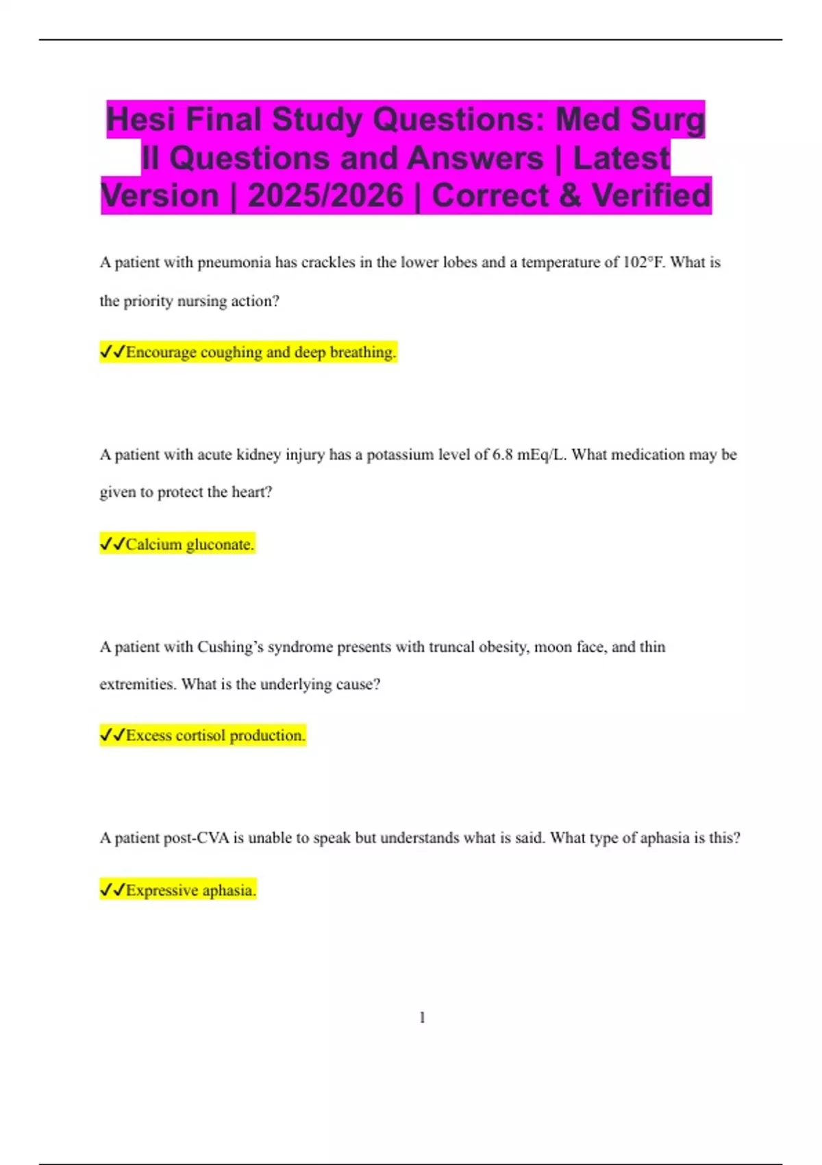 Hesi Final Study Questions: Med Surg II Questions and Answers | Latest Version | 2025/2026 | Correct & Verified A patient with pneumonia has crackles in the lower lobes and a temperature of 102°F. What is the priority nursing action? Encourage coughing and deep breathing. A patient with acute kidney injury has a potassium level of 6.8 mEq/L. What medication may be given to protect the heart? Calcium gluconate. A patient with Cushing’s syndrome presents with truncal obesity, moon face, and thin extremities. What is the underlying cause? Excess cortisol production. A patient post-CVA is unable to speak but understands what is said. What type of aphasia is this? Expressive aphasia. 2 A patient on digoxin has a heart rate of 48 bpm. What should the nurse do first? Hold the medication and notify the provider. A patient with tuberculosis is starting rifampin therapy. What side effect should the nurse teach about? Orange discoloration of body fluids. A patient with hypothyroidism is prescribed levothyroxine. When should the medication be taken? In the morning on an empty stomach. A patient with suspected meningitis has nuchal rigidity and photophobia. What isolation is required? Droplet precautions. A patient with heart failure is prescribed furosemide. Which electrolyte imbalance is most likely? Hypokalemia. 3 A patient with hyperthyroidism has bulging eyes. What is the priority nursing intervention? Protect the eyes from injury and dryness. A patient with Guillain-Barré syndrome is at risk for what life-threatening complication? Respiratory failure. A patient with cirrhosis has abdominal distention due to ascites. What procedure may be performed to relieve symptoms? Paracentesis. A patient with peripheral artery disease reports pain in the legs when walking that is relieved by rest. What is this symptom called? Intermittent claudication. A patient with severe burns has a high risk for which electrolyte imbalance during the first 24 hours? Hyperkalemia.