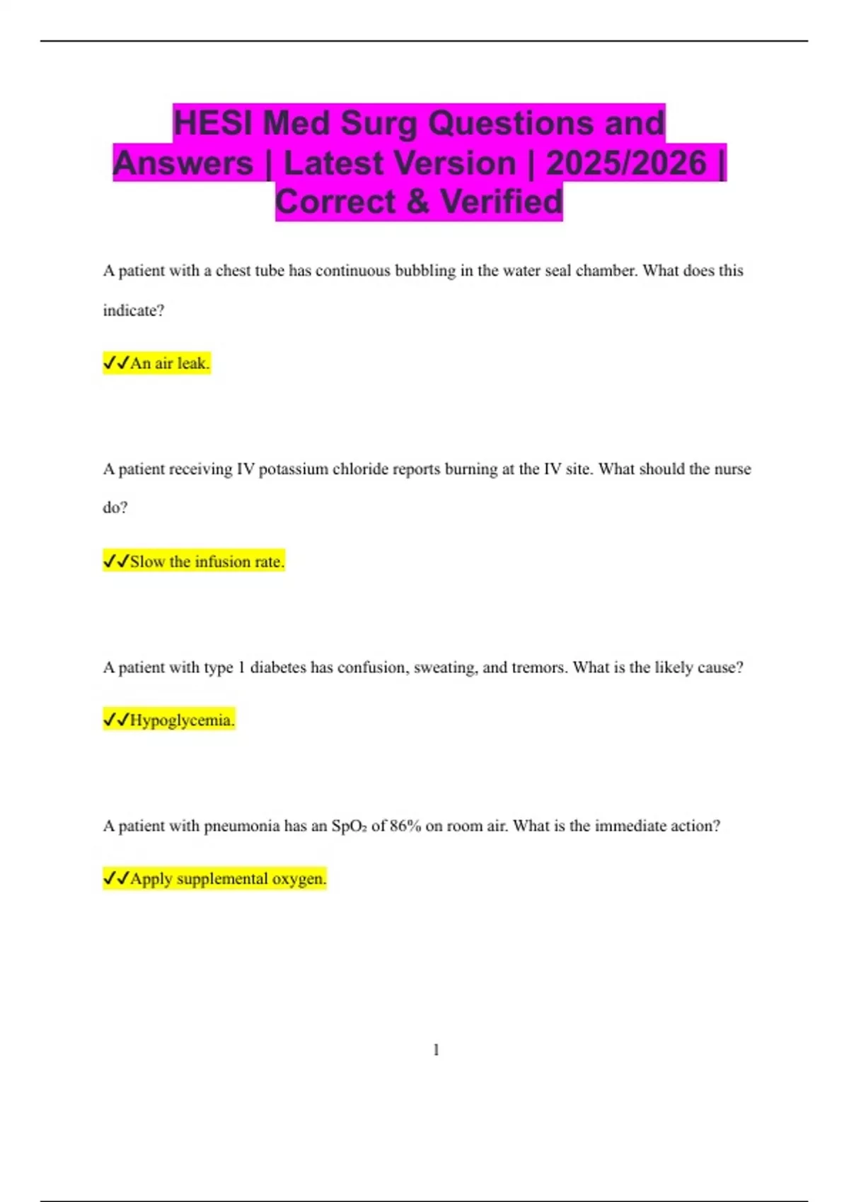 HESI Med Surg Questions and Answers | Latest Version | 2025/2026 | Correct & Verified A patient with a chest tube has continuous bubbling in the water seal chamber. What does this indicate? An air leak. A patient receiving IV potassium chloride reports burning at the IV site. What should the nurse do? Slow the infusion rate. A patient with type 1 diabetes has confusion, sweating, and tremors. What is the likely cause? Hypoglycemia. A patient with pneumonia has an SpO2 of 86% on room air. What is the immediate action? Apply supplemental oxygen. 2 A patient with a tracheostomy suddenly becomes unable to breathe after coughing. What is the priority action? Remove and replace the inner cannula. A patient with hypothyroidism reports weight gain and constipation. What is the expected TSH level? Elevated. A patient with a history of seizures is found unresponsive after jerking movements. What is the immediate action? Place the patient in the recovery position. A patient with COPD is receiving 2 L/min oxygen via nasal cannula. Which oxygen saturation is acceptable? 88% to 92%. A patient with a urinary catheter has cloudy urine and a fever. What is the suspected complication? Urinary tract infection. 3 A patient with a hip fracture is at high risk for what postoperative complication? Deep vein thrombosis. A patient receiving total parenteral nutrition develops shortness of breath and chest pain. What is the priority assessment? Check for signs of air embolism. A patient with ulcerative colitis has severe diarrhea. What is the primary concern? Fluid and electrolyte imbalance. A patient with chronic heart failure gains 3 pounds in two days. What does this indicate? Fluid retention. A patient with meningitis is sensitive to light. What is this symptom called? Photophobia. 4 A patient with asthma is wheezing and using accessory muscles to breathe. What is the priority nursing action? Administer prescribed bronchodilator. A patient with burns over 40% of the body surface is