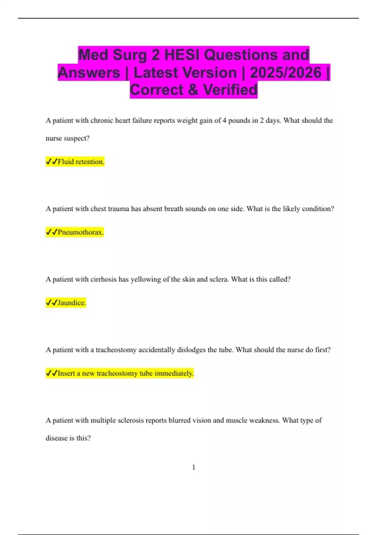 Med Surg 2 HESI Questions and Answers | Latest Version | 2025/2026 | Correct & Verified A patient with chronic heart failure reports weight gain of 4 pounds in 2 days. What should the nurse suspect? Fluid retention. A patient with chest trauma has absent breath sounds on one side. What is the likely condition? Pneumothorax. A patient with cirrhosis has yellowing of the skin and sclera. What is this called? Jaundice. A patient with a tracheostomy accidentally dislodges the tube. What should the nurse do first? Insert a new tracheostomy tube immediately. A patient with multiple sclerosis reports blurred vision and muscle weakness. What type of disease is this? 2 Autoimmune demyelinating disease. A patient with diabetic ketoacidosis has fruity breath odor. What causes this smell? Acetone production. A patient receiving chemotherapy has a WBC count of 2,000/mm3. What is the priority action? Implement neutropenic precautions. A patient with asthma is using an albuterol inhaler more than every 4 hours. What does this indicate? Poorly controlled asthma. A patient after thyroidectomy develops tingling around the mouth and fingertips. What is the likely cause? Hypocalcemia. A patient with end-stage renal disease has itching and grayish skin color. What causes this symptom? 3 Uremic toxins in the skin. A patient with liver failure has confusion and tremors. What condition should the nurse suspect? Hepatic encephalopathy. A patient after hip replacement is instructed not to bend the hip more than 90 degrees. What is this to prevent? Hip dislocation. A patient with acute pancreatitis reports severe abdominal pain radiating to the back. Which position can help relieve the pain? Sitting and leaning forward. A patient with a chest tube has continuous bubbling in the water seal chamber. What does this indicate? Air leak. A patient with a recent myocardial infarction develops crushing chest pain unrelieved by nitroglycerin. What complication should the nurse suspect? 4 Reinfarction. A patient with a suspected stroke arrives with slurred speech and facial droop. What is the priority action? Initiate rapid stroke protocol and call for CT scan. A patient on IV heparin develops sudden severe abdominal pain and hypotension. What complication should be suspected? Internal bleeding. A patient with COPD has a barrel-shaped chest. What causes this appearance? Chronic air trapping.