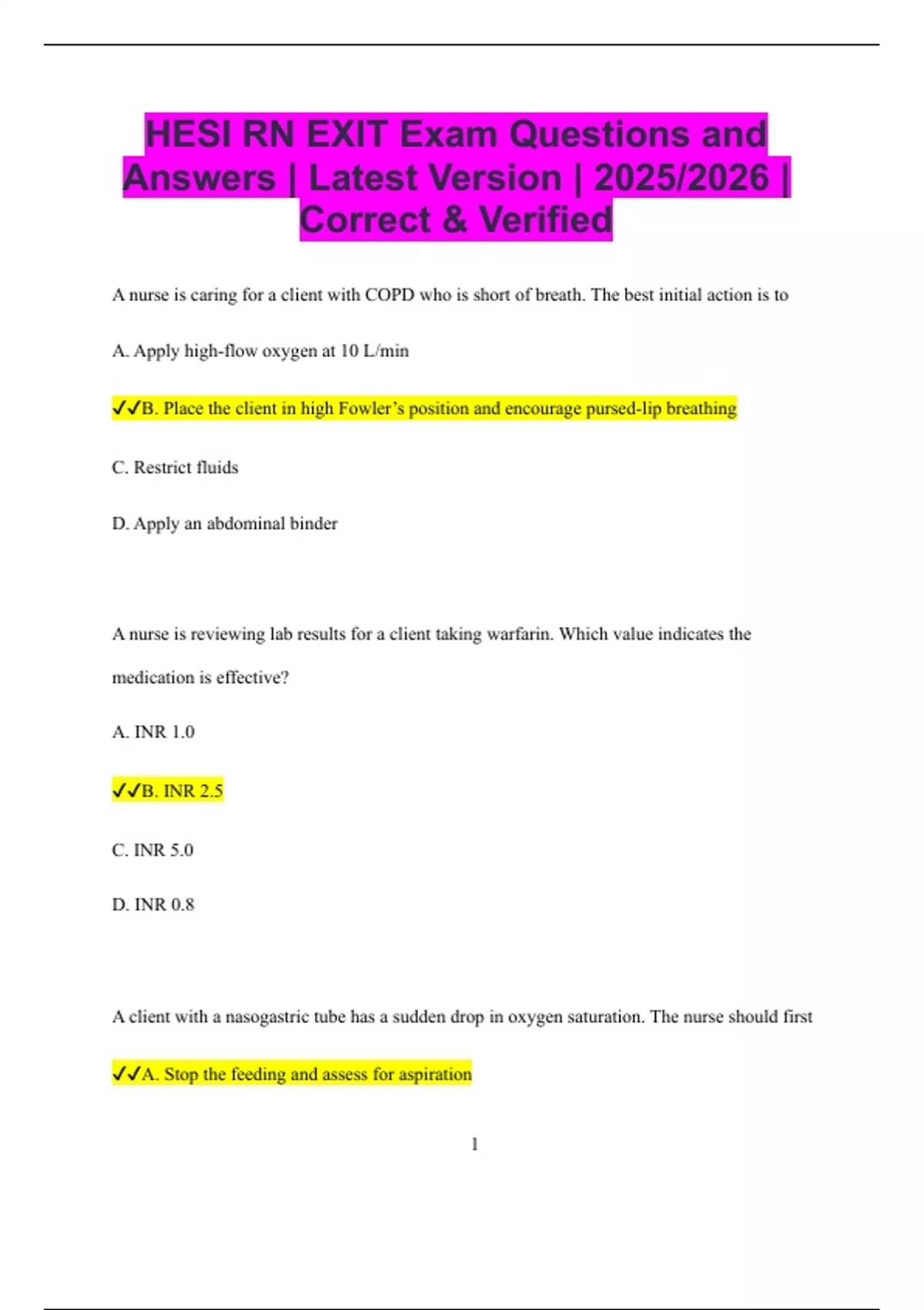 HESI RN EXIT Exam Questions and Answers | Latest Version | 2025/2026 | Correct & Verified A nurse is caring for a client with COPD who is short of breath. The best initial action is to A. Apply high-flow oxygen at 10 L/min B. Place the client in high Fowler’s position and encourage pursed-lip breathing C. Restrict fluids D. Apply an abdominal binder A nurse is reviewing lab results for a client taking warfarin. Which value indicates the medication is effective? A. INR 1.0 B. INR 2.5 C. INR 5.0 D. INR 0.8 A client with a nasogastric tube has a sudden drop in oxygen saturation. The nurse should first A. Stop the feeding and assess for aspiration 2 B. Increase the feeding rate C. Flush the tube with water D. Remove the tube immediately A nurse is caring for a client in labor who is receiving an oxytocin infusion. The nurse notes late decelerations on the fetal monitor. The priority action is to A. Turn the client to her side and stop the oxytocin B. Increase the oxytocin rate C. Document the finding and continue D. Check cervical dilation A client with type 1 diabetes reports feeling shaky and sweaty. The nurse should first A. Check the urine for ketones B. Check the blood glucose level C. Administer glucagon without testing D. Restrict fluids A nurse is teaching a client about nitroglycerin use for chest pain. Which instruction is correct? 3 A. “Take up to 10 tablets in a row.” B. “If pain is not relieved after 3 doses, call emergency services.” C. “Store tablets in the refrigerator door.” D. “Chew the tablets for faster relief.” A nurse is caring for a client with schizophrenia who reports hearing voices. The best initial response is A. “I don’t hear the voices, but I understand they are real to you.” B. “You must ignore the voices.” C. “The voices aren’t real, so stop listening.” D. “Why do you think you hear voices?” A client with heart failure is receiving furosemide. Which finding requires immediate follow-up? A. Weight loss of 1 kg in 2 days B. Potassium level of 2.8 mEq/L C. Blood pressure of 110/70 mmHg D. Urine output of 1500 mL in 24 hours 4 A nurse is caring for a client with a chest tube to water seal. Which finding requires intervention? A. Gentle bubbling in the suction control chamber B. Continuous bubbling in the water seal chamber C. Fluctuation of water level with breathing D. Drainage of 50 mL in 1 hour A nurse is preparing to administer digoxin. Which assessment is most important before giving? A. Blood pressure B. Apical pulse for 1 minute C. Respiratory rate D. Capillary refill A nurse is reviewing a medication order for
