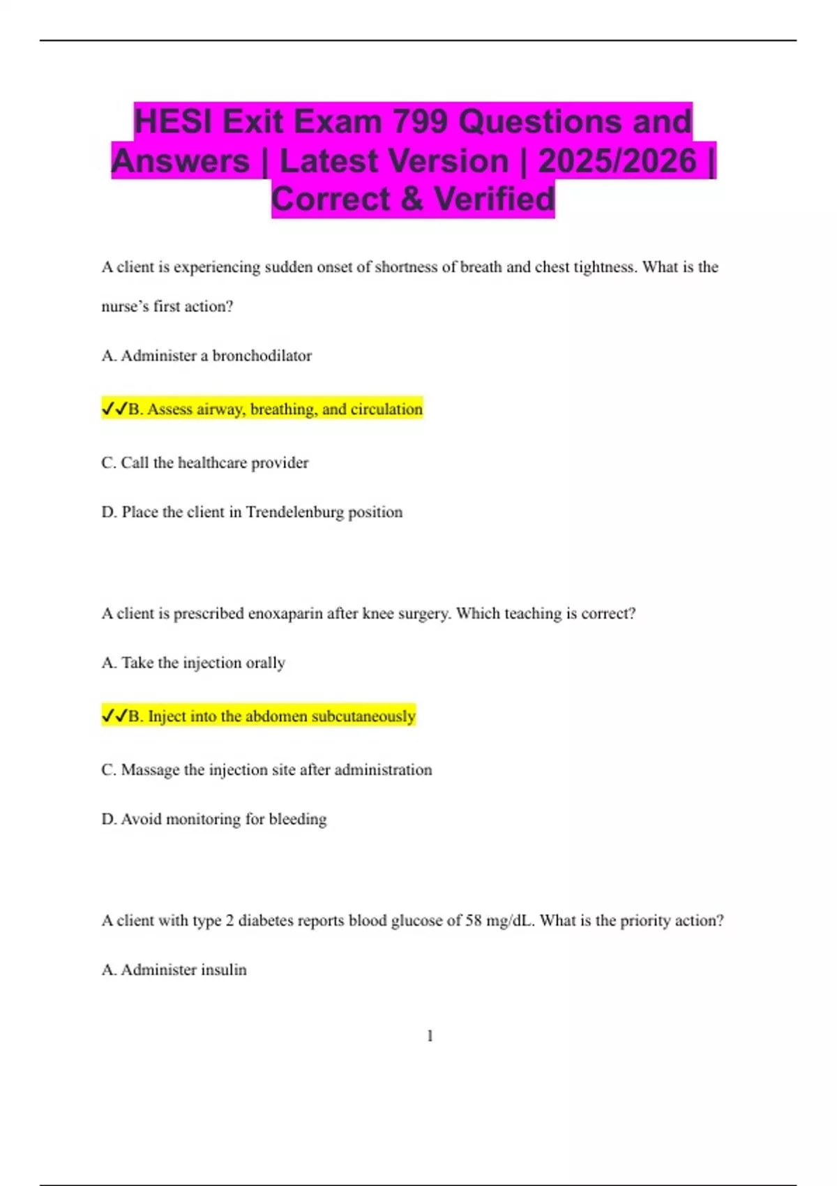 HESI Exit Exam 799 Questions and Answers | Latest Version | 2025/2026 | Correct & Verified A client is experiencing sudden onset of shortness of breath and chest tightness. What is the nurse’s first action? A. Administer a bronchodilator B. Assess airway, breathing, and circulation C. Call the healthcare provider D. Place the client in Trendelenburg position A client is prescribed enoxaparin after knee surgery. Which teaching is correct? A. Take the injection orally B. Inject into the abdomen subcutaneously C. Massage the injection site after administration D. Avoid monitoring for bleeding A client with type 2 diabetes reports blood glucose of 58 mg/dL. What is the priority action? A. Administer insulin 2 B. Give 15 g of fast-acting carbohydrate C. Check hemoglobin A1C D. Encourage exercise A client with a nasogastric tube is receiving enteral feeding. Which action prevents aspiration? A. Keep the client supine B. Flush tube once per day C. Elevate head of bed 30–45 degrees during feeding D. Clamp the tube after feeding A client is prescribed prednisone for asthma. Which side effect requires teaching? A. Dry mouth B. Increased appetite C. Hyperglycemia D. Mild fatigue A nurse is assessing a client with left-sided heart failure. Which finding is expected? A. Peripheral edema 3 B. Dyspnea and pulmonary crackles C. Jugular vein distention D. Hepatomegaly A client is receiving vancomycin IV. Which finding requires immediate intervention? A. Mild nausea B. Red rash on neck and chest C. Slight headache D. Fatigue A client with a urinary tract infection is prescribed ciprofloxacin. Which statement indicates understanding? A. “I should take the medication on an empty stomach only.” B. “I should avoid dairy products while taking this medication.” C. “I can stop the medication once I feel better.” D. “I should increase salt intake while on this medication.” A client with hypokalemia is prescribed potassium chloride. Which instruction is important? 4 A. Take medication on an empty stomach B. Never crush or chew extended-release tablets C. Reduce fluid intake D. Avoid monitoring potassium levels A nurse is caring for a client postoperatively who is drowsy and has a respiratory rate of 7/min. What is the priority intervention? A. Reposition the client