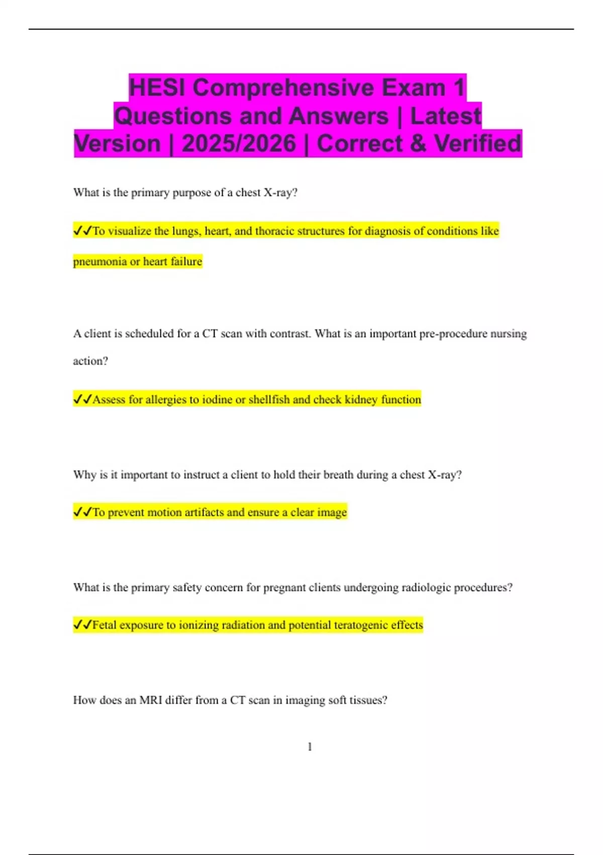 HESI Comprehensive Exam 1 Questions and Answers | Latest Version | 2025/2026 | Correct & Verified What is the primary purpose of a chest X-ray? To visualize the lungs, heart, and thoracic structures for diagnosis of conditions like pneumonia or heart failure A client is scheduled for a CT scan with contrast. What is an important pre-procedure nursing action? Assess for allergies to iodine or shellfish and check kidney function Why is it important to instruct a client to hold their breath during a chest X-ray? To prevent motion artifacts and ensure a clear image What is the primary safety concern for pregnant clients undergoing radiologic procedures? Fetal exposure to ionizing radiation and potential teratogenic effects How does an MRI differ from a CT scan in imaging soft tissues? 2 MRI uses magnetic fields and radio waves, providing better soft tissue contrast without ionizing radiation What is the nurse’s role when a client receives a fluoroscopic study? Provide shielding, monitor for radiation exposure, and ensure client understanding of procedure Why is it important to remove all metal objects before an MRI? Metal can distort images and pose a safety risk due to the strong magnetic field What preparation is necessary for a barium swallow study? Client may need to fast, drink contrast, and follow instructions for imaging to evaluate swallowing and esophagus How does an ultrasound create images of internal organs? By using high-frequency sound waves that reflect off tissues to produce real-time images What should a nurse monitor after a client receives intravenous contrast for a CT scan? 3 Signs of allergic reaction such as rash, itching, or difficulty breathing Why is positioning critical in radiographic imaging? Correct positioning ensures accurate visualization of anatomy and reduces the need for repeat exposures What is the purpose of a mammogram? To screen for breast cancer and detect small tumors or abnormalities What client teaching is essential before a nuclear medicine scan? Explain that a small amount of radioactive tracer will be used and that it is generally safe and painless How does a PET scan assist in cancer diagnosis? By detecting metabolic activity and identifying malignant tissues through radioactive glucose uptake Why must clients remain still during an MRI or CT scan? 4 Movement can blur images and reduce diagnostic