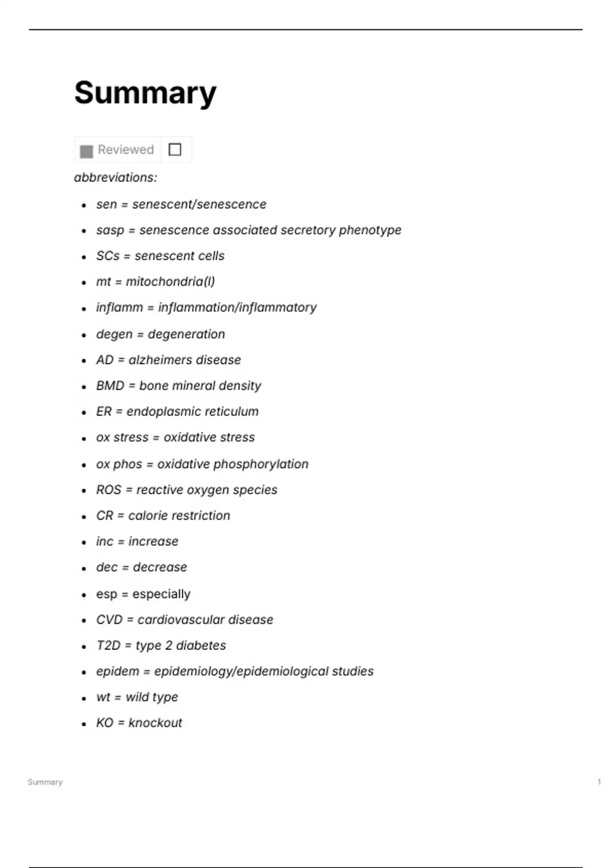 A comprehensive, highly detailed summary of the Kings College London Biology of Ageing module (6BBL0325) taken in the 3rd year of courses such as Biomedical Science in the Faculty of Life Sciences and Medicine. The summary covers all the lectures in depth, as well as extra reading from textbooks and multiple recent (-2025) academic primary research papers already incorporated into the notes, so no extra work is needed to obtain the highest marks. I memorised this document alone and won the prize for best mark in the year with 80% in the exam! Topics covered include highly trending areas of medicine such as diabetes, inflammation, senescence, mitochondrial dysfunction, oxidative stress, calorie restriction, sarcopenia, neurogenesis, cardiovascular disease, reproduction, skin aging, and kidney disease. It would therefore also be relevant to any medical student or trainee or anyone interested in anti-aging science! PLEASE NOTE: this is a LONG and detailed document (reflecting the price), it is not quick/condensed notes. The exam for this module is essay based so each topics' content is structured in a logical order and written in phrases directly ready to be implanted into any essay on the topic, essentially giving you ready-made answers for any question that could come up.