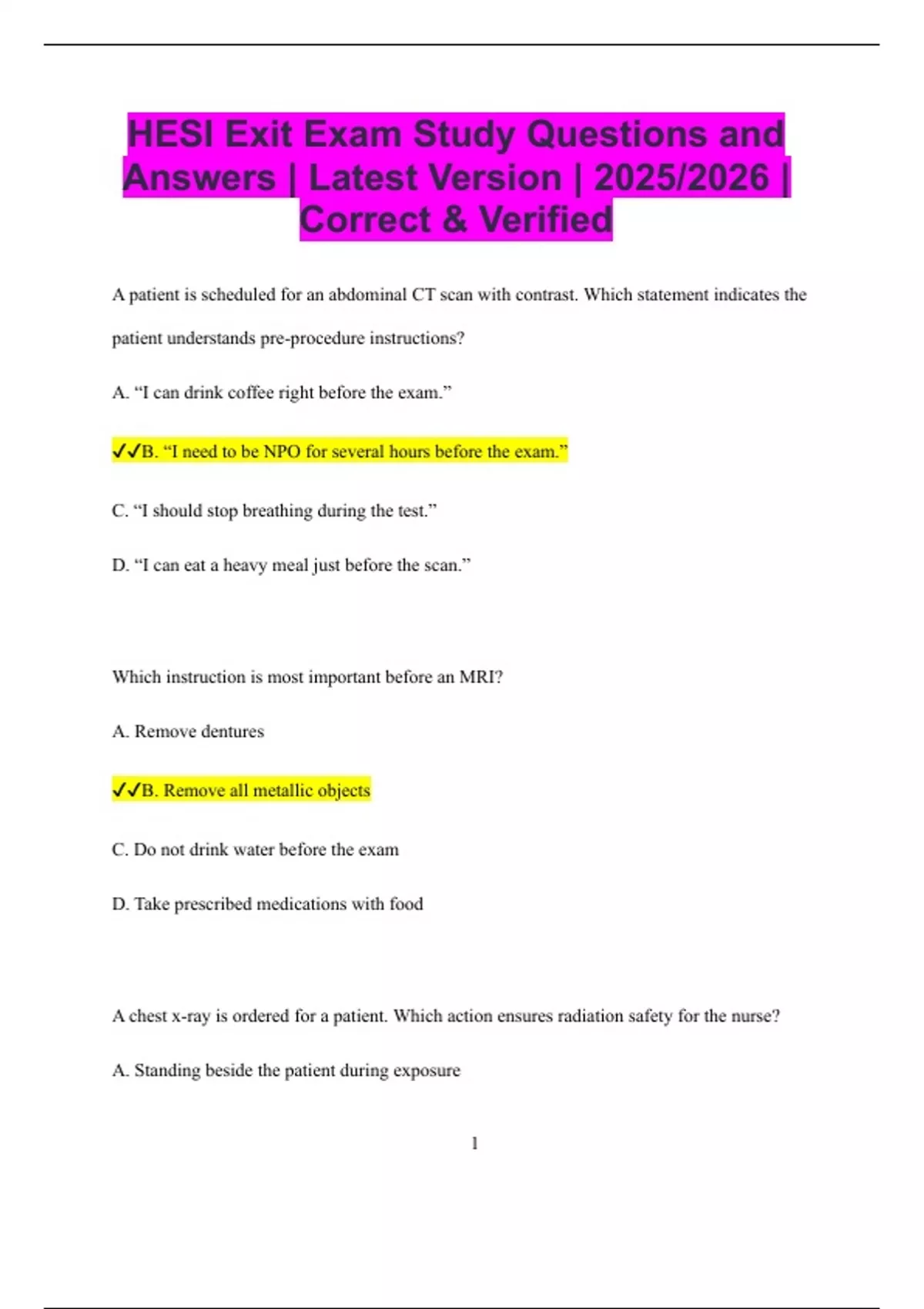 HESI Exit Exam Study Questions and Answers | Latest Version | 2025/2026 | Correct & Verified A patient is scheduled for an abdominal CT scan with contrast. Which statement indicates the patient understands pre-procedure instructions? A. “I can drink coffee right before the exam.” B. “I need to be NPO for several hours before the exam.” C. “I should stop breathing during the test.” D. “I can eat a heavy meal just before the scan.” Which instruction is most important before an MRI? A. Remove dentures B. Remove all metallic objects C. Do not drink water before the exam D. Take prescribed medications with food A chest x-ray is ordered for a patient. Which action ensures radiation safety for the nurse? A. Standing beside the patient during exposure 2 B. Wearing a lead apron and holding the patient’s arm C. Standing behind a protective barrier during exposure D. Asking another nurse to hold the patient without protection A patient asks why barium swallow is needed. Which is the best nurse response? A. “It helps check your lungs.” B. “It outlines your esophagus and stomach for the x-ray.” C. “It measures your blood flow.” D. “It evaluates your brain function.” Which patient should the nurse question before administering contrast dye? A. A patient with hypertension B. A patient with history of kidney disease C. A patient with a fracture D. A patient with seasonal allergies After a barium enema, which instruction should the nurse provide? A. Avoid drinking fluids for 24 hours 3 B. Drink plenty of fluids to prevent constipation C. Remain NPO until bowel movement D. Avoid ambulation for the rest of the day Which finding must be reported immediately after IV contrast administration? A. Mild nausea B. Difficulty breathing and swelling of lips C. Warm sensation at injection site D. Metallic taste in the mouth A nurse prepares a patient for an ultrasound. Which instruction is most accurate? A. The procedure uses sound waves and does not involve radiation B. The procedure requires general anesthesia C. The patient must be exposed to x-rays