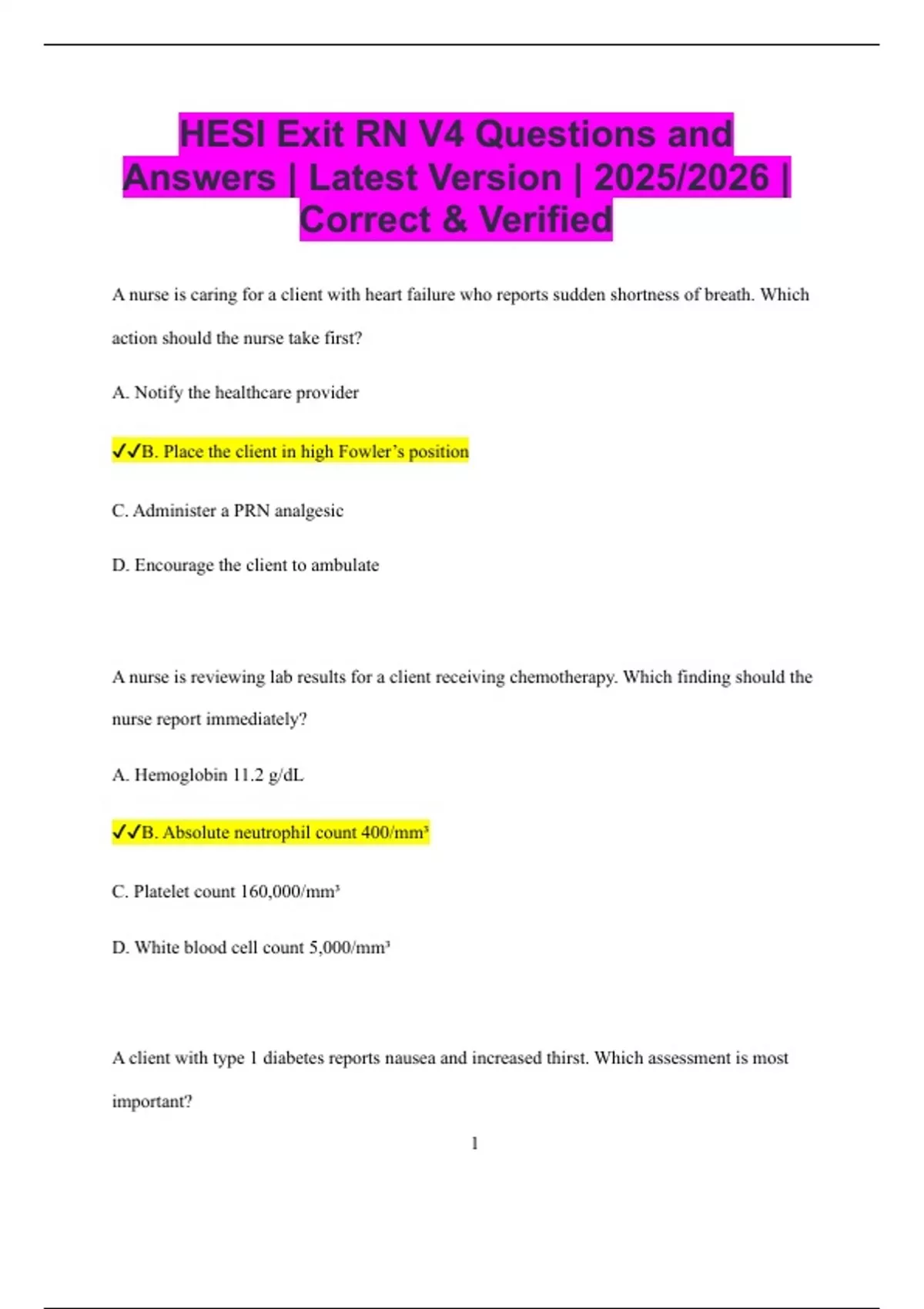HESI Exit RN V4 Questions and Answers | Latest Version | 2025/2026 | Correct & Verified A nurse is caring for a client with heart failure who reports sudden shortness of breath. Which action should the nurse take first? A. Notify the healthcare provider B. Place the client in high Fowler’s position C. Administer a PRN analgesic D. Encourage the client to ambulate A nurse is reviewing lab results for a client receiving chemotherapy. Which finding should the nurse report immediately? A. Hemoglobin 11.2 g/dL B. Absolute neutrophil count 400/mm3 C. Platelet count 160,000/mm3 D. White blood cell count 5,000/mm3 A client with type 1 diabetes reports nausea and increased thirst. Which assessment is most important? 2 A. Blood pressure B. Blood glucose level C. Daily weight D. Capillary refill A nurse is preparing to administer blood to a client. Which action is most important to reduce the risk of a transfusion reaction? A. Verify client identification with another nurse B. Pre-medicate the client with acetaminophen C. Warm the blood prior to administration D. Monitor vital signs every 30 minutes A nurse is caring for a client with COPD. Which oxygen delivery device is most appropriate? A. Non-rebreather mask at 15 L/min B. Simple face mask at 8 L/min C. Nasal cannula at 2 L/min D. Venturi mask at 50% 3 A nurse is teaching a client about warfarin therapy. Which statement indicates understanding? A. “I will eat more green leafy vegetables.” B. “I will have my INR checked regularly.” C. “I will take aspirin for headaches.” D. “I can stop taking the medication when I feel better.” A nurse is assessing a client with a chest tube. Which finding requires immediate intervention? A. Occasional bubbling in the water seal chamber B. Continuous bubbling in the water seal chamber C. Drainage of 80 mL over 4 hours D. Fluctuation of water level with respirations A nurse is caring for a client who is postoperative following abdominal surgery. Which intervention helps prevent atelectasis? A. Encourage bed rest B. Limit fluid intake C. Use incentive spirometer hourly D. Apply abdominal binder tightly 4 A nurse is caring for a client with suspected meningitis. Which action should the nurse take first? A. Place the client in droplet precautions B. Administer IV antibiotics C. Assess level of consciousness D. Prepare the client for lumbar puncture A nurse is teaching a client about a new prescription for digoxin. Which statement indicates the client understands the teaching? A. “I should take my pulse once a week.” B. “I should hold the medication if my pulse is below 60.” C. “I can double my dose if I miss one.”