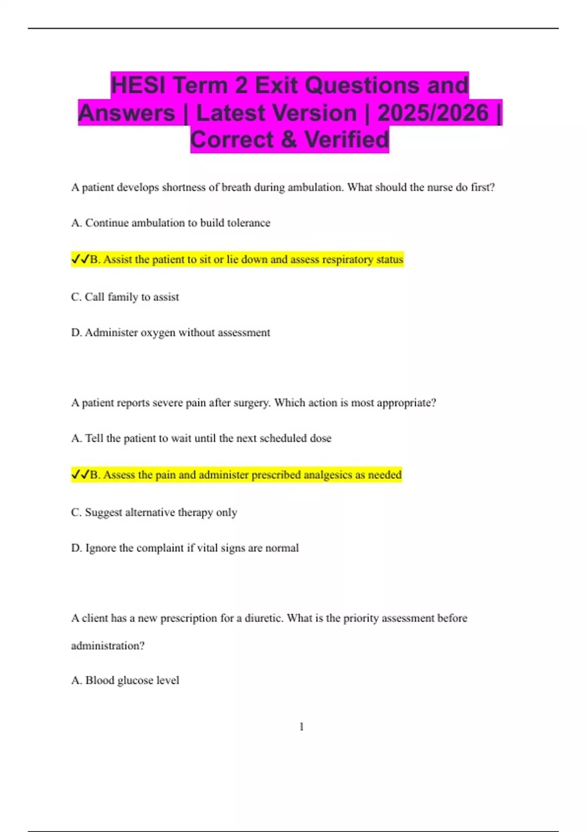 ✔✔B. Assist the patient to sit or lie down and assess respiratory status