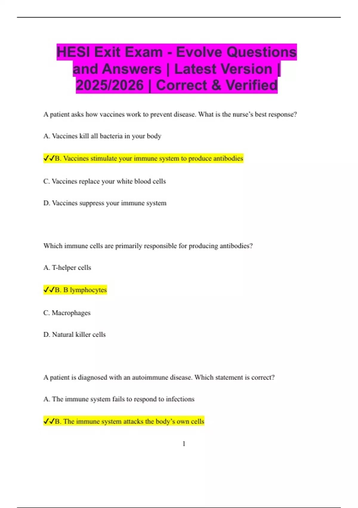 HESI Exit Exam - Evolve Questions and Answers | Latest Version | 2025/2026 | Correct & Verified A patient asks how vaccines work to prevent disease. What is the nurse’s best response? A. Vaccines kill all bacteria in your body B. Vaccines stimulate your immune system to produce antibodies C. Vaccines replace your white blood cells D. Vaccines suppress your immune system Which immune cells are primarily responsible for producing antibodies? A. T-helper cells B. B lymphocytes C. Macrophages D. Natural killer cells A patient is diagnosed with an autoimmune disease. Which statement is correct? A. The immune system fails to respond to infections B. The immune system attacks the body’s own cells 2 C. The patient has a temporary immune deficiency D. Only B cells are affected Which immunoglobulin is the first antibody produced in response to infection? A. IgA B. IgM C. IgG D. IgE A patient receiving immunotherapy asks why their skin is red and itchy. What is the nurse’s best explanation? A. This is unrelated to treatment B. The immune system is failing C. It is a normal immune response caused by activation of immune cells D. It indicates infection Which type of immunity is acquired through breast milk? A. Active immunity 3 B. Passive immunity C. Cell-mediated immunity D. Artificial immunity A patient is prescribed a booster vaccine. What is the primary purpose? A. Treat existing infection B. Suppress the immune system C. Reinforce and prolong immunity D. Destroy antibodies Which immune cells directly destroy virus-infected cells? A. B lymphocytes B. Neutrophils C. Cytotoxic T cells D. Mast cells A patient is allergic to peanuts and experiences swelling and hives. What type of hypersensitivity is this? 4 A. Type II B. Type III C. Type I (immediate hypersensitivity) D. Type IV Which antibody class is primarily involved in allergic reactions? A. IgG B. IgE C. IgA D. IgM